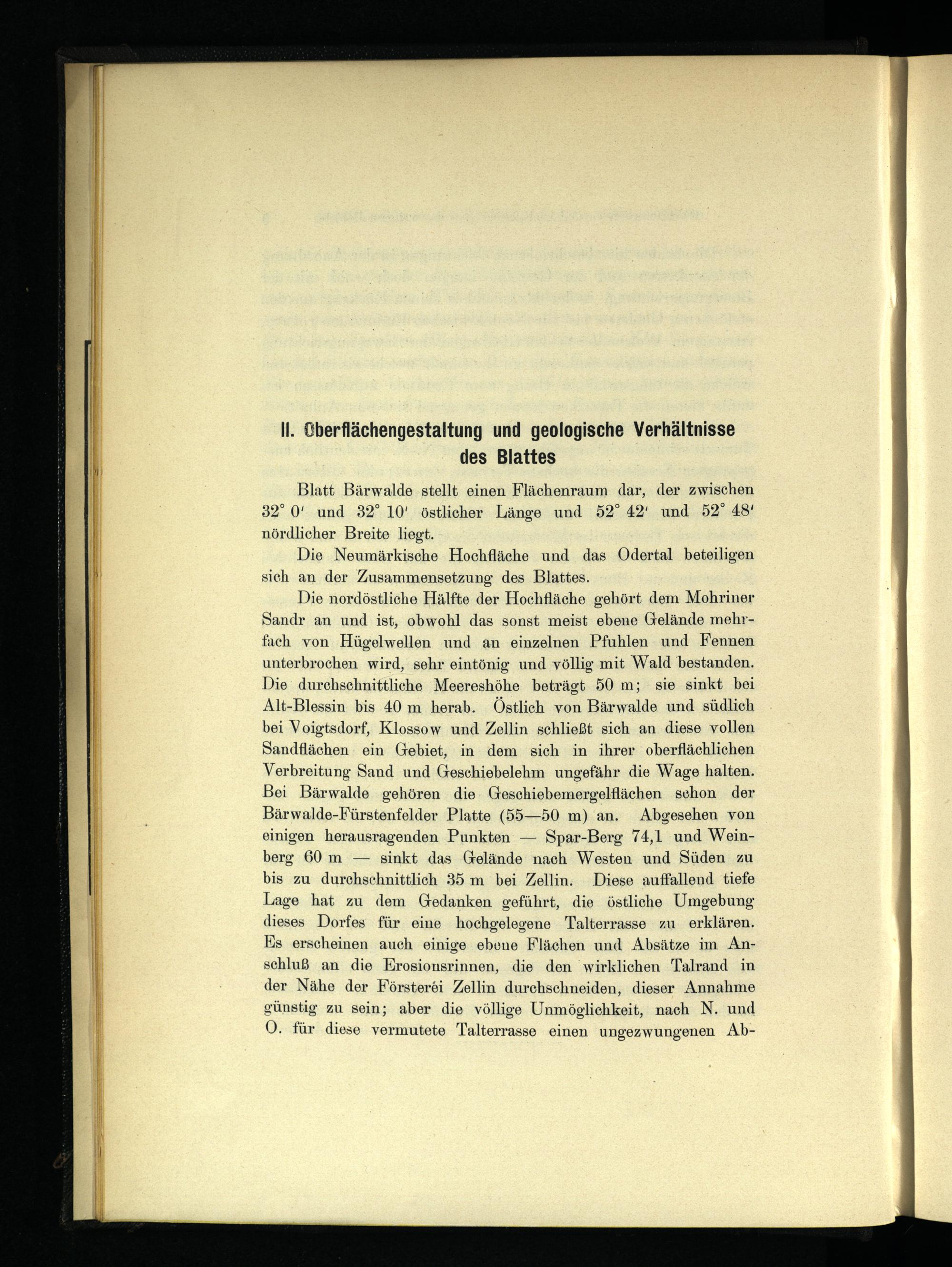 Die nordöstliche Hälfte der Hochfläche gehört dem Mohriner Sandr an und ist, obwohl das sonst meist ebene Gelände mehrfach von Hügelwellen und an einzelnen Pfuhlen und Fennen unterbrochen wird, sehr eintönig und völlig mit Wald bestanden. Die durchschnittliche Meereshöhe beträgt 50 m; sie sinkt bei Alt-Blessin bis 40 m herab. Östlich von Bärwalde und südlich bei Voigtsdorf, Klossow und Zellin schließt sich an diese vollen Sandflächen ein Gebiet, in dem sich in ihrer oberflächlichen Verbreitung Sand und Geschiebelehm ungefähr die Wage halten. Bei Bärwalde gehören die Geschiebemergelflächen sehon der Bärwalde-Fürstenfelder Platte(55—50 m) an. Abgesehen von einigen herausragenden Punkten— Spar-Berg 74,1 und Weinberg 60 m— sinkt das Gelände nach Westen und Süden zu bis zu durchschnittlich 35 m bei Zellin. Diese auffallend tiefe Lage hat zu dem Gedanken geführt, die östliche Umgebung dieses Dorfes für eine hochgelegene Talterrasse zu erklären. Es erscheinen auch einige ebene Flächen und Absätze im Anschluß an die Erosionsrinnen, die den wirklichen Talrand in der Nähe der Försterei Zellin durchschneiden, dieser Annahme günstig zu sein; aber die völlige Unmöglichkeit, nach N. und O. für diese vermutete Talterrasse einen ungezwungenen Ab