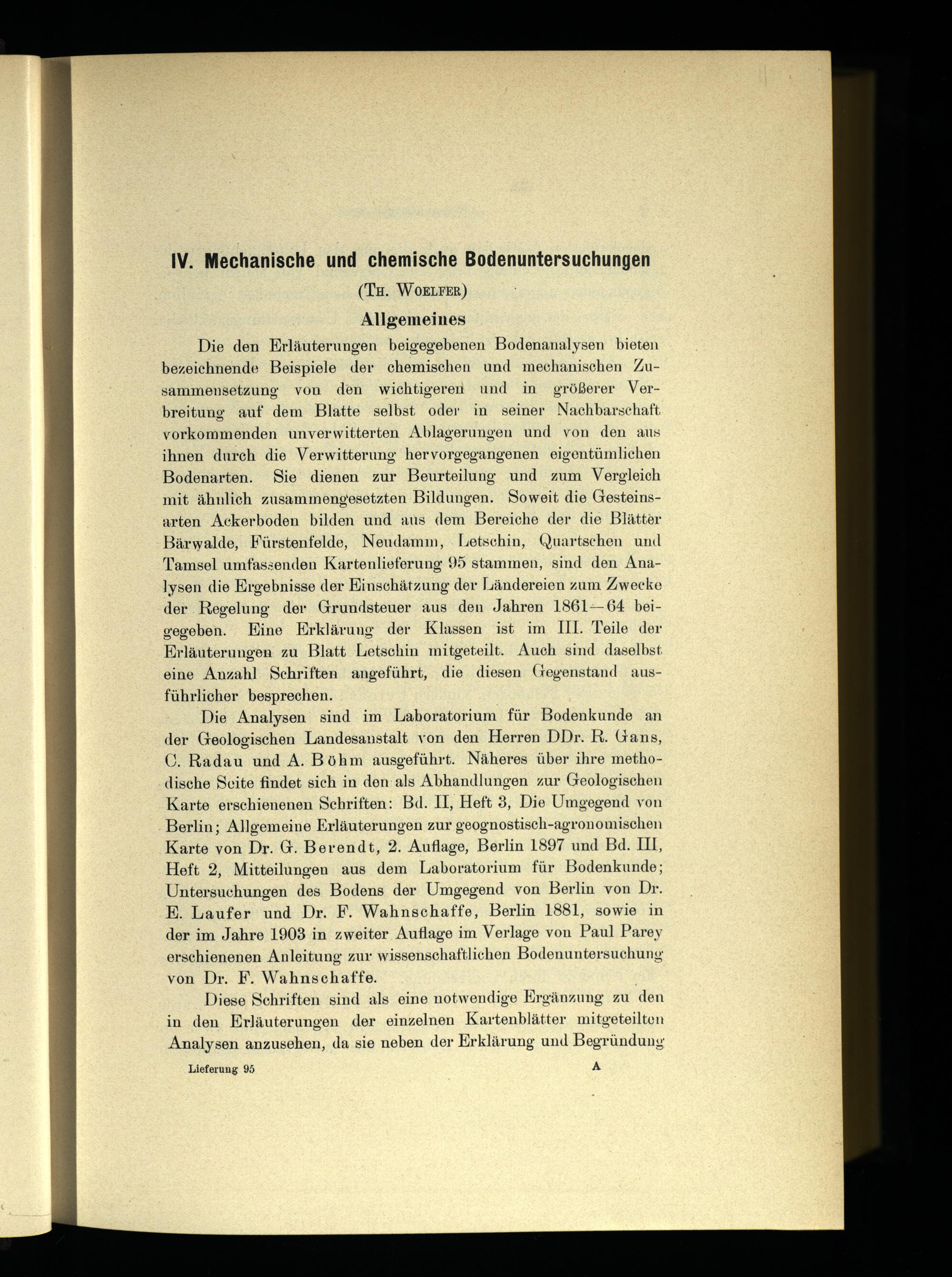 Die Analysen sind im Laboratorium für Bodenkunde an der Geologischen Landesanstalt von den Herren DDr. R. Gans, C. Radau und A. Böhm ausgeführt. Näheres über ihre methodische Seite findet sich in den: als Abhandlungen zur Geologischen Karte erschienenen Schriften: Bd. II, Heft 3, Die Umgegend von Berlin; Allgemeine Erläuterungen zur geognostisch-agronomischen Karte von Dr. G. Berendt, 2. Auflage, Berlin 1897 und Bd. III, Heft 2, Mitteilungen aus dem Laboratorium für Bodenkunde; Untersuchungen des Bodens der Umgegend von Berlin von Dr. E. Laufer und Dr. F. Wahnschaffe, Berlin 1881, sowie in der im Jahre 1908 in zweiter Auflage im Verlage von Paul Parey erschienenen Anleitung zur wissenschaftlichen Bodenuntersuchung von Dr. F. Wahnschaffe.