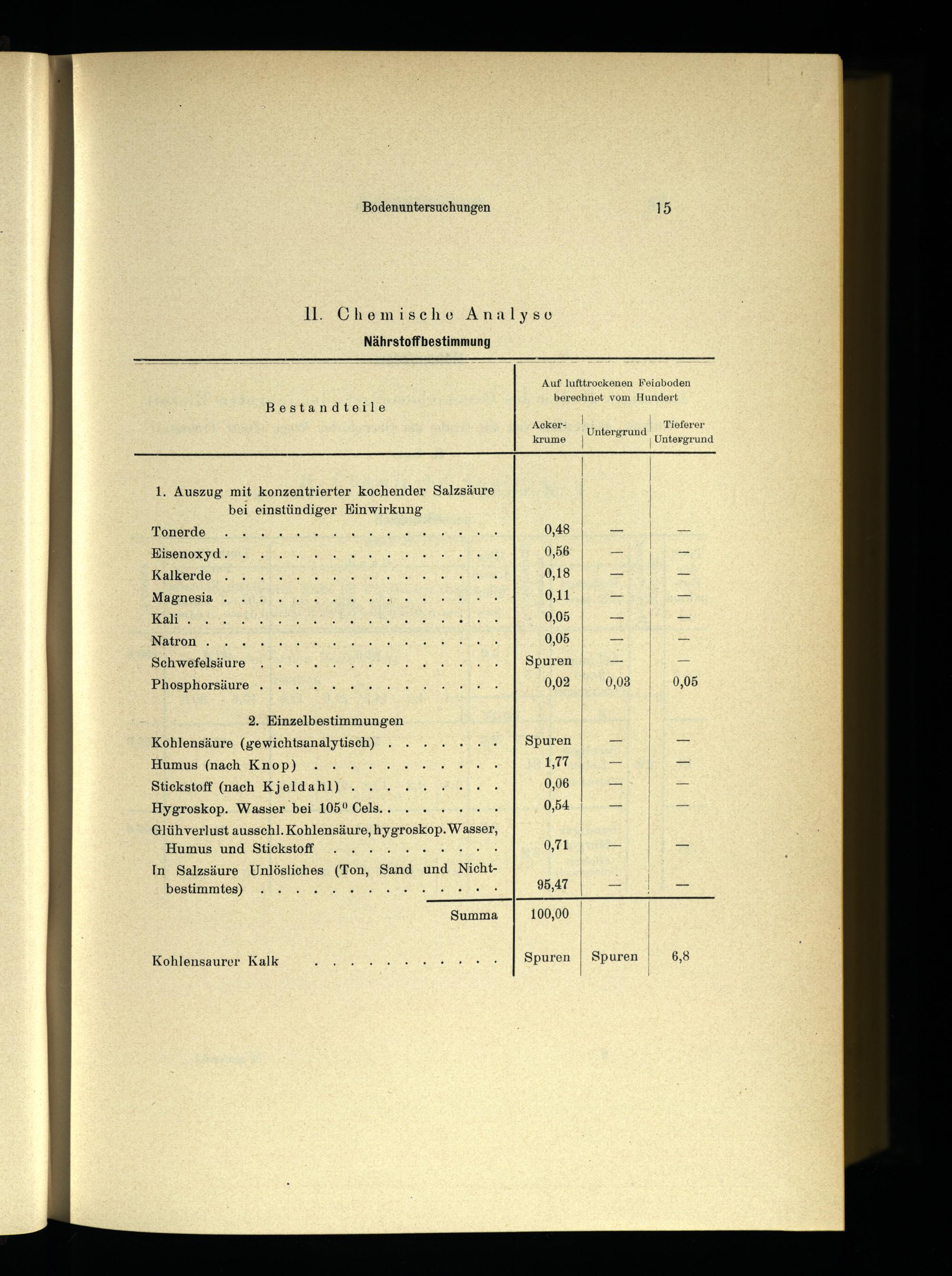 Kohlensäure(gewichtsanalytisch)...... Spuren Humus(nach Knop) 2. 00. a 1,77 Stickstoff(nach Kjeldahl).. 000 A 0,06 Hygroskop. Wasser bei 105° Cels...... 0,54| Glühverlust ausschl. Kohlensäure, hygroskop. Wasser,|