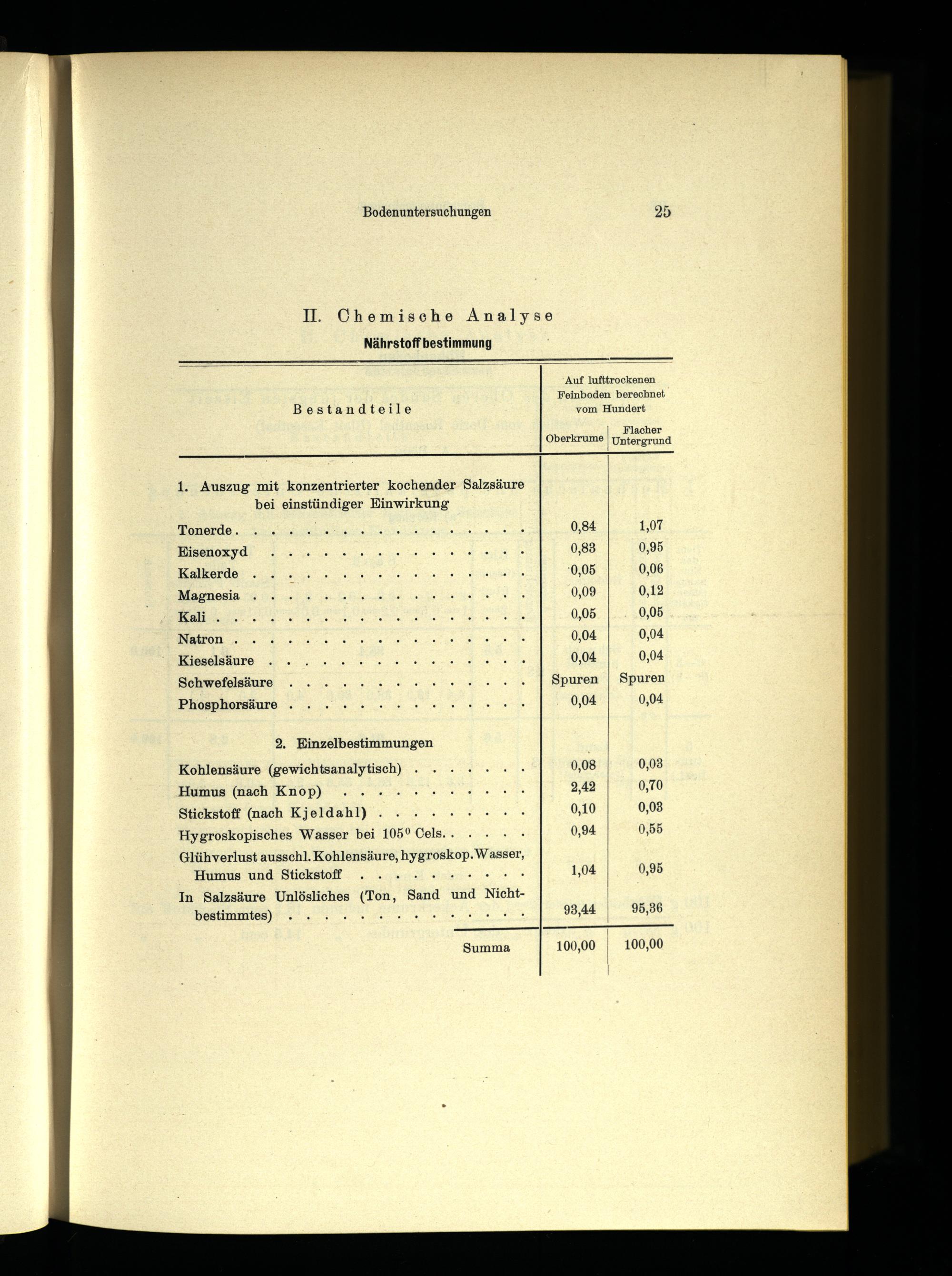 Kohlensäure(gewichtsanalytisch)....++ 0,08 Humus(nach Knöß).... 1++ wu 2,42 Stickstoff(nach Kjeldahl)......++ 0,10 Hygroskopisches Wasser bei 105° Cels..... 0,94|