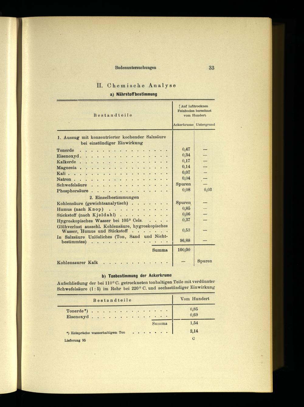 2. Einzelbestimmungen Kohlensäure(gewichtsanalytisch).....+ Spuren, Humus(nach Knop). 2... 0.0 040 0,85 Stickstoff(nach Kjeldahl)... vn 0,06 Hygroskopisches Wasser bei 105° Och A 0,37