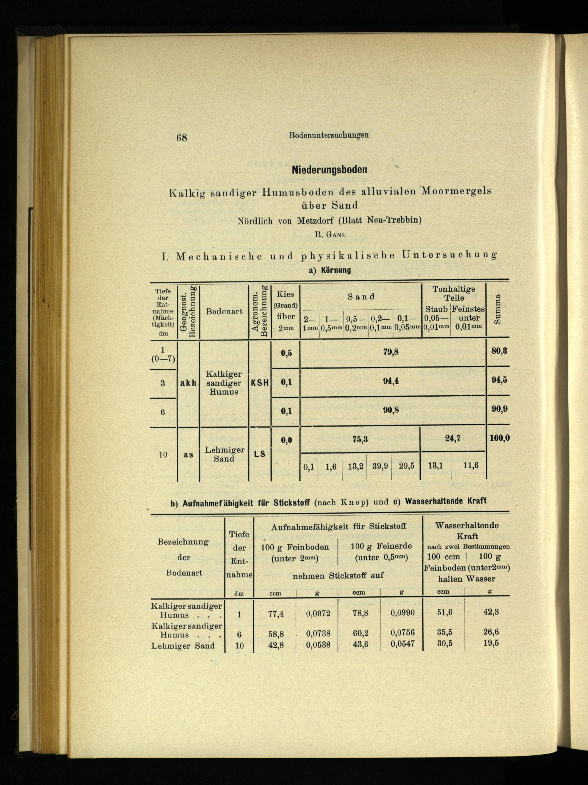 ; Aufnahmefähigkeit für Stickstoff Wasserhaltende Tiefe Kraft der| 100 g Feinboden 100 g Feinerde| nach zwei Bestimmungen der Ent:(unter 2mm)(unter 0,5mm)|100 ccm| 100g Feinboden(unter2mm) halten Wasser