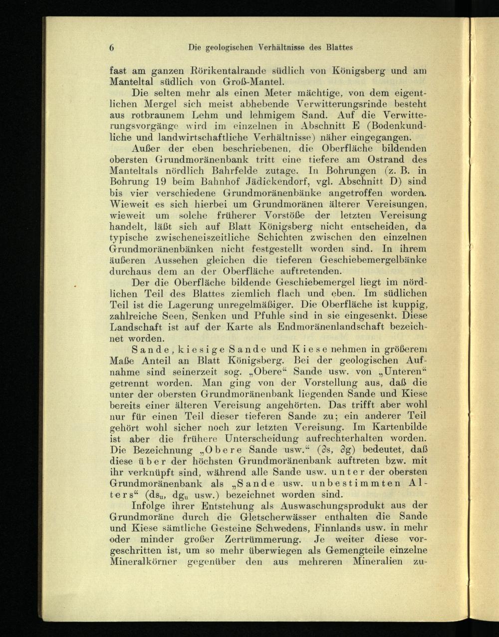 Außer der eben beschriebenen, die Oberfläche bildenden obersten Grundmoränenbank tritt eine tiefere am Ostrand des Manteltals nördlich Bahrfelde zutage. In Bohrungen (z. B. in Bohrung 19 beim Bahnhof Jädickendorf, vgl. Abschnitt D) sind bis vier verschiedene Grundmoränenbänke angetroffen worden. Wieweit es sich hierbei um Grundmoränen älterer Vereisungen, wieweit um solche früherer Vorstöße der letzten Vereisung handelt, läßt sich auf Blatt Königsberg nicht entscheiden, da typische zwischeneiszeitliche Schichten zwischen den einzelnen Grundmoränenbänken nicht festgestellt worden sind. In ihrem äußeren Aussehen gleichen die tieferen Geschiebemergelbänke durchaus dem an der Oberfläche auftretenden.