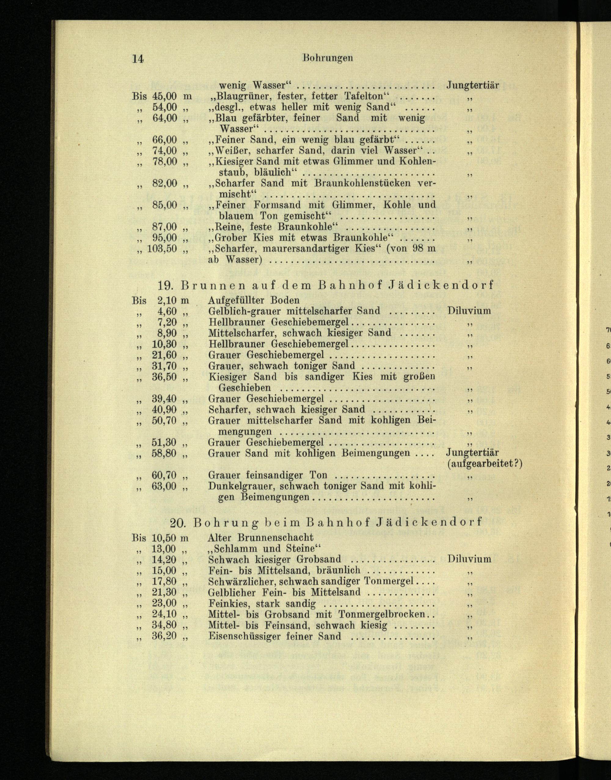 ,, Grober Kies mit etwas Braunkohle" ,, Scharfer, maurersandartiger Kies"( von 98 m ab Wasser)