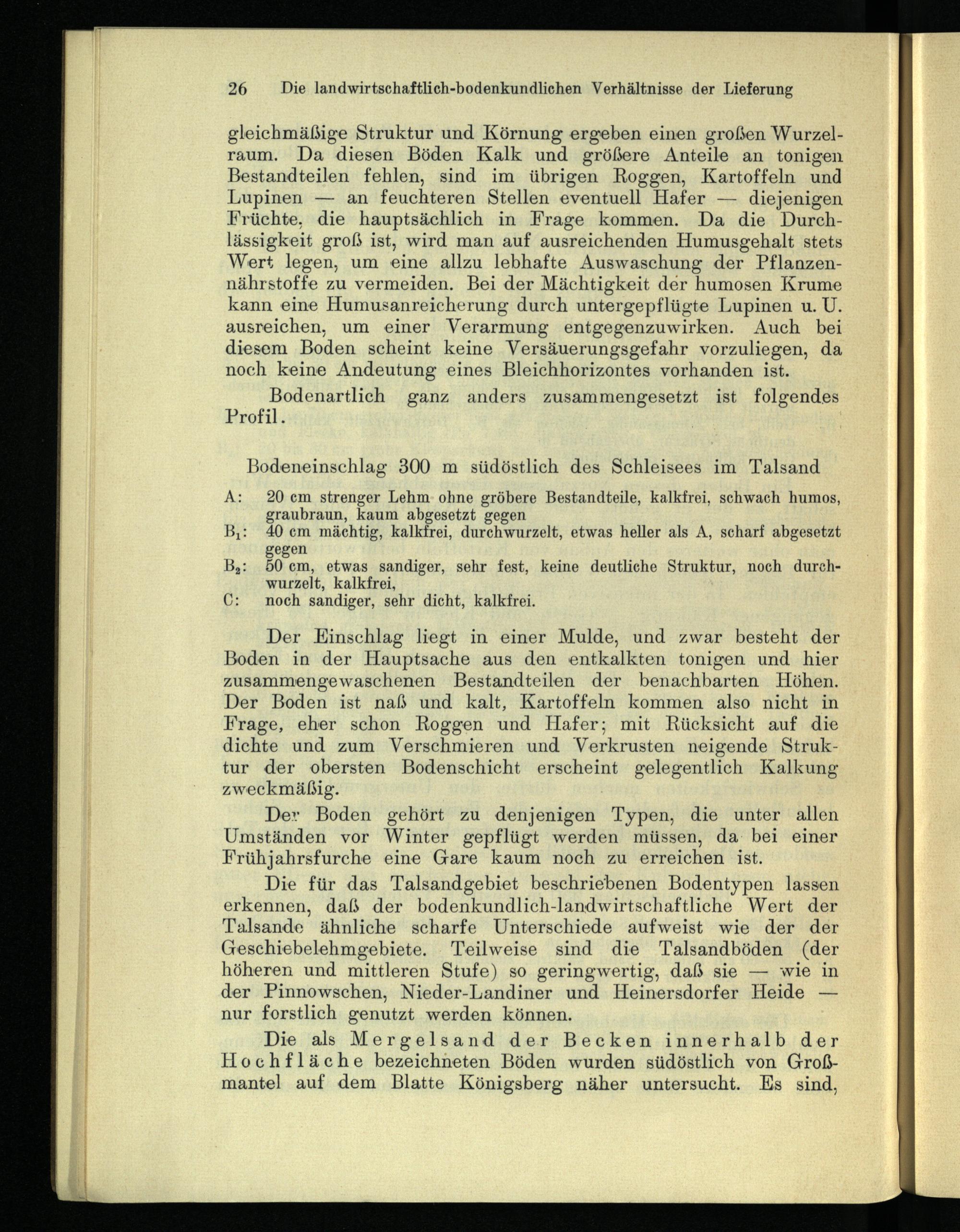 gleichmäßige Struktur und Körnung ergeben einen großen Wurzelraum. Da diesen Böden Kalk und größere Anteile an tonigen Bestandteilen fehlen, sind im übrigen Roggen, Kartoffeln und Lupinen — an feuchteren Stellen eventuell Hafer — diejenigen Früchte, die hauptsächlich in Frage kommen. Da die Durchlässigkeit groß ist, wird man auf ausreichenden Humusgehalt stets Wert legen, um eine allzu lebhafte Auswaschung der Pflanzennährstoffe zu vermeiden. Bei der Mächtigkeit der humosen Krume kann eine Humusanreicherung durch untergepflügte Lupinen u. U. ausreichen, um einer Verarmung entgegenzuwirken. Auch bei diesem Boden scheint keine Versäuerungsgefahr vorzuliegen, da noch keine Andeutung eines Bleichhorizontes vorhanden ist.