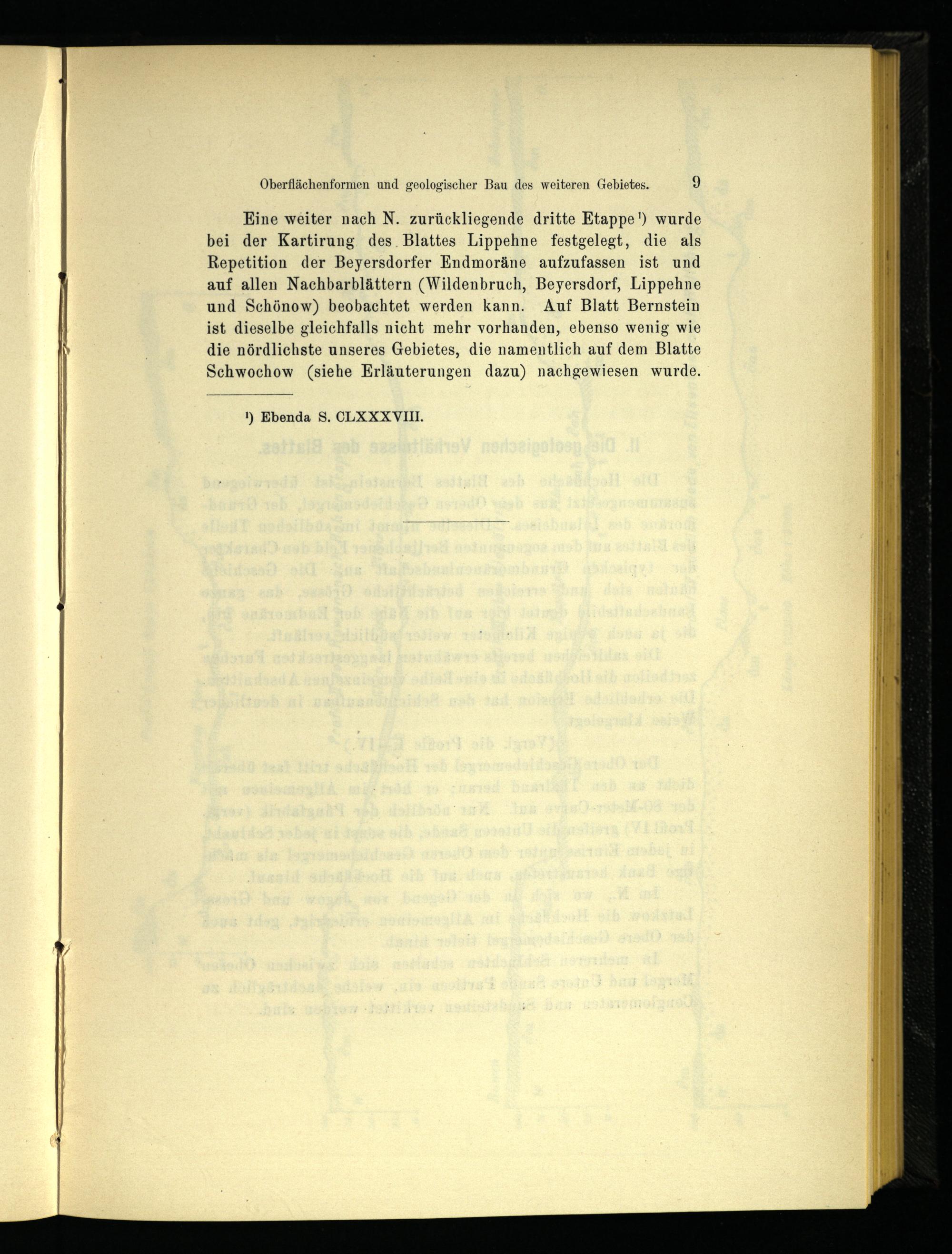 Eine weiter nach N. zurückliegende dritte Etappe’) wurde bei der Kartirung des. Blattes Lippehne festgelegt, die als Repetition der Beyersdorfer Endmoräne aufzufassen ist und auf allen Nachbarblättern(Wildenbruch, Beyersdorf, Lippehne und Schönow) beobachtet werden kann. Auf Blatt Bernstein ist dieselbe gleichfalls nicht mehr vorhanden, ebenso wenig wie die nördlichste unseres Gebietes, die namentlich auf dem Blatte Schwochow(siehe Erläuterungen dazu) nachgewiesen wurde.