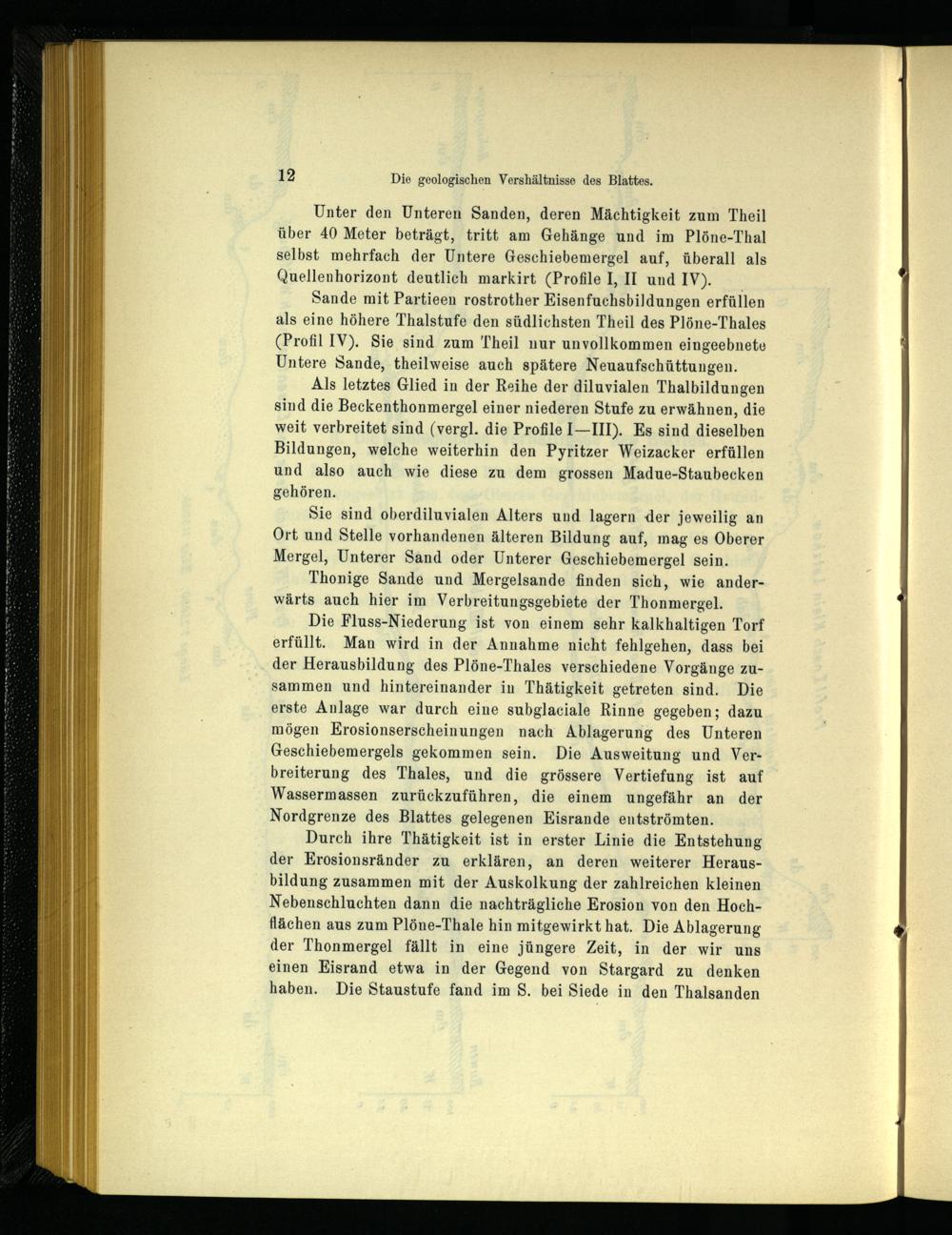 Unter den Unteren Sanden, deren Mächtigkeit zum Theil über 40 Meter beträgt, tritt am Gehänge und im Plöne-Thal selbst mehrfach der Untere Geschiebemergel auf, überall als Quellenhorizont deutlich markirt(Profile I, IT und IV).