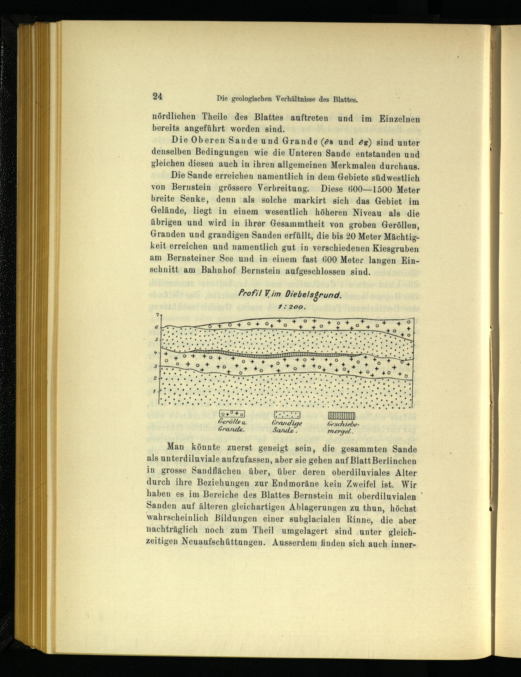 Man könnte zuerst geneigt sein, die gesammten Sande als unterdiluviale aufzufassen, aber sie gehen auf Blatt Berlinchen in grosse Sandflächen über, über deren oberdiluviales Alter durch ihre Beziehungen zur Endmoräne kein Zweifel ist. Wir haben es im Bereiche des Blattes Bernstein mit oberdiluvialen Sanden auf älteren gleichartigen Ablagerungen zu thun, höchst wahrscheinlich Bildungen einer subglacialen Rinne, die aber nachträglich noch zum Theil umgelagert sind unter gleichzeitigen Neuaufschüttungen. Ausserdem finden sich auch inner