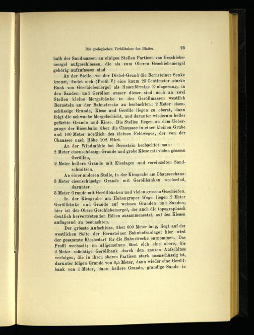 An der Stelle, wo der Diebel-Grund die Bernsteiner Senke kreuzt,‘ findet sich(Profil V) eine kaum 25 Centimeter starke Bank von Geschiebemergel als linsenförmige Einlagerung; in den Sanden und Geröllen ausser dieser sind noch an zwei Stellen kleine Mergelbänke in den Geröllmassen westlich Bernstein an der Bahnstrecke zu beobachten; 2 Meter eisenschüssige Grande, Kiese und Gerölle liegen zu oberst, dann folgt die schwache Mergelschicht, und darunter wiederum heller gefärbte Grande. und Kiese . Die Stellen liegen an dem Uebergange der Eisenbahn über die Chaussee in einer kleinen Grube und 100 Meter nördlich des kleinen Feldweges, der von der Chaussee nach Höhe 102 führt.