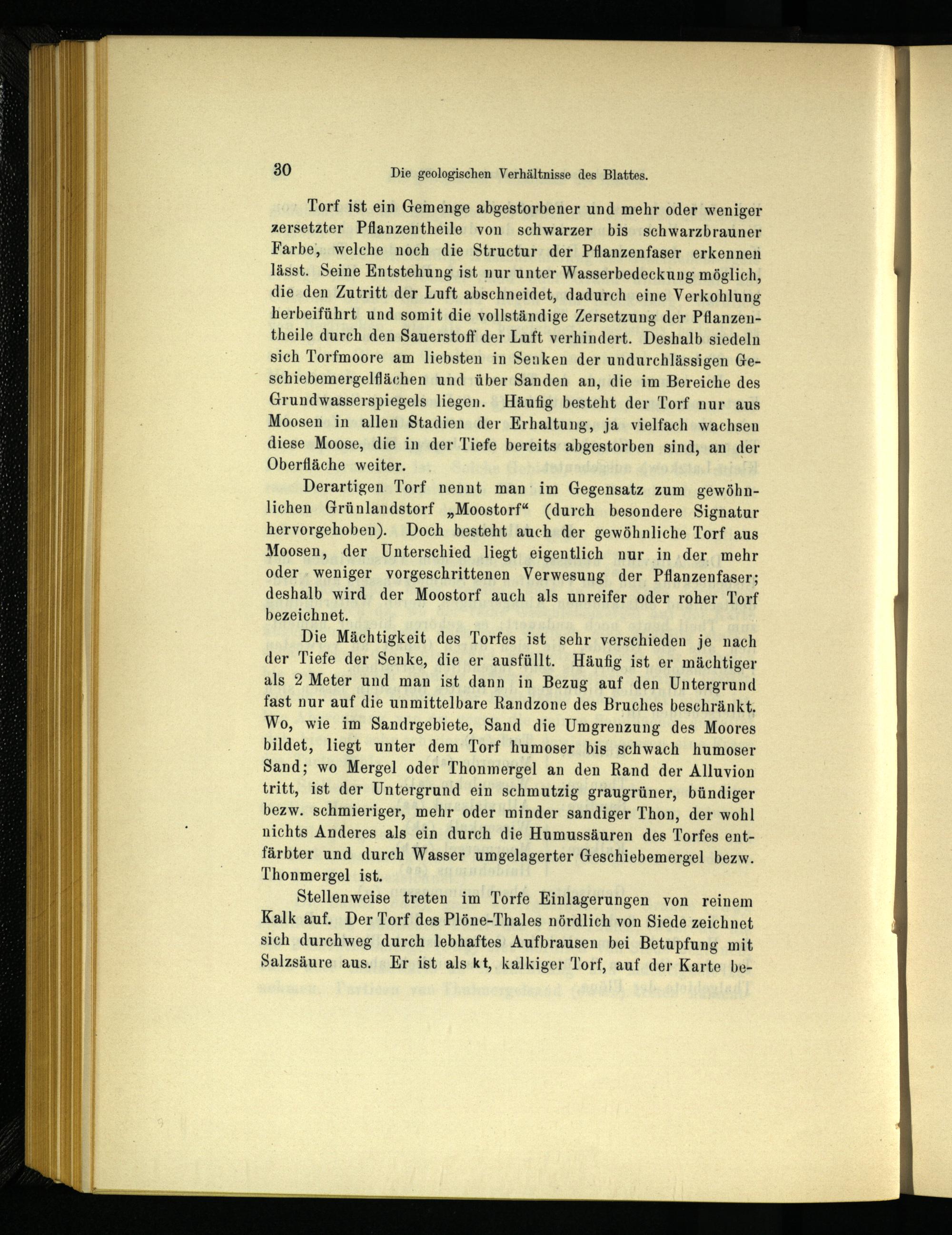 Stellenweise treten im Torfe Einlagerungen von reinem Kalk auf. Der Torf des Plöne-Thales nördlich von Siede zeichnet sich durchweg durch lebhaftes Aufbrausen bei Betupfung mit Salzsäure aus. Er ist als kt, kalkiger Torf, auf der Karte be