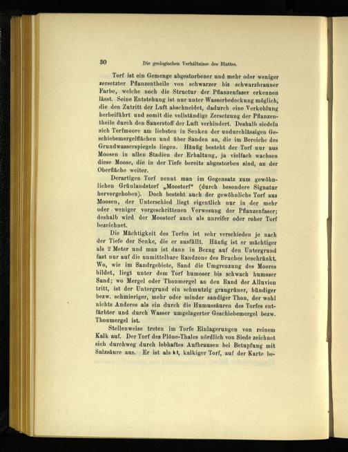 Torf ist ein Gemenge abgestorbener und mehr oder weniger zersetzter Pflanzentheile von schwarzer bis schwarzbrauner Farbe, welche noch die Structur der Pflanzenfaser erkennen lässt. Seine Entstehung ist nur unter Wasserbedeckung möglich, die den Zutritt der Luft abschneidet, dadurch eine Verkohlung herbeiführt und somit die vollständige Zersetzung der Pflanzentheile durch den Sauerstoff der Luft verhindert. Deshalb siedeln sich Torfmoore am liebsten in Senken der undurchlässigen Geschiebemergelflächen und über Sanden an, die im Bereiche des Grundwasserspiegels liegen. Häufig besteht der Torf nur aus Moosen in allen Stadien der Erhaltung, ja vielfach wachsen diese Moose, die in der Tiefe bereits abgestorben sind, an der Oberfläche weiter.