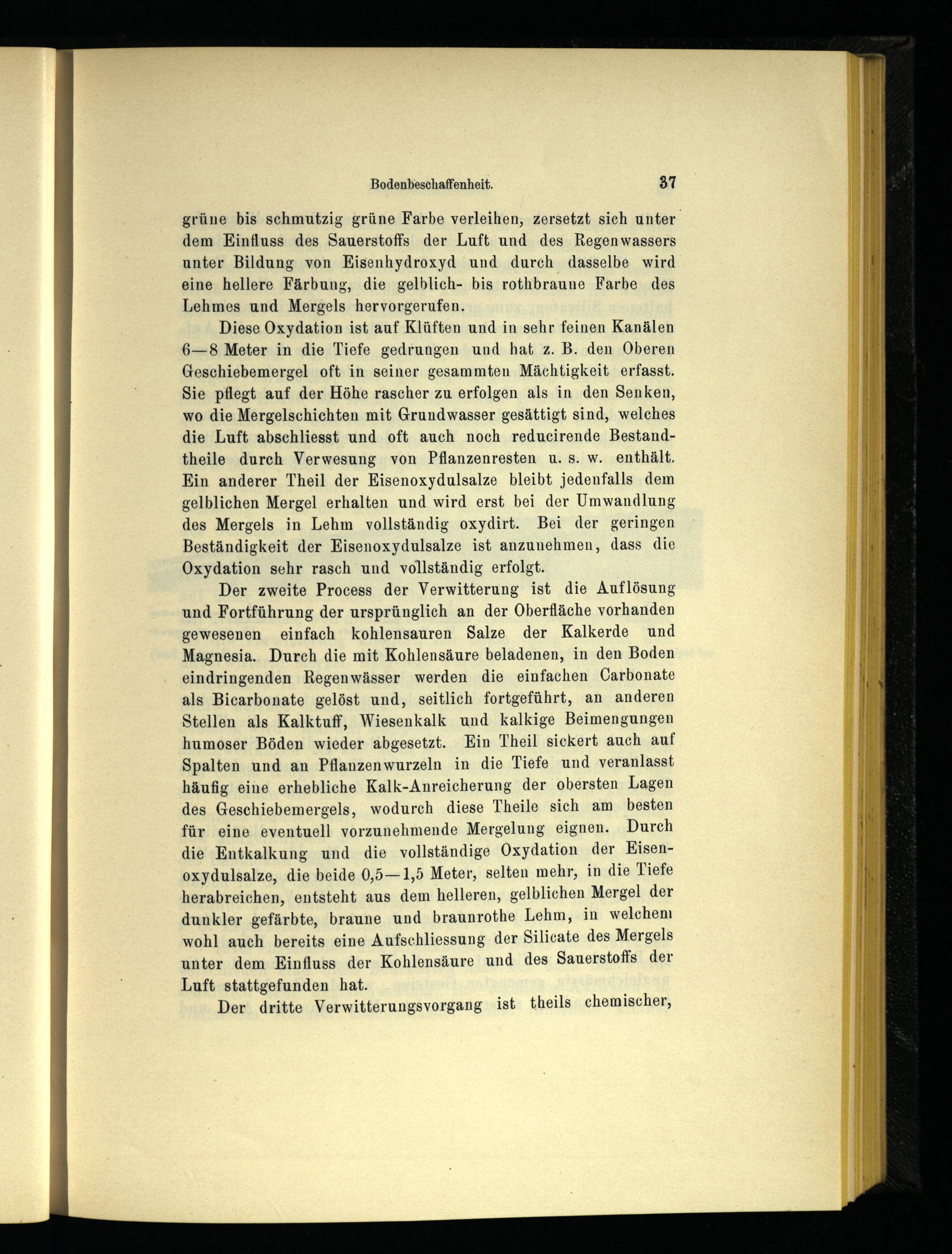 Der zweite Process der Verwitterung ist die Auflösung und Fortführung der ursprünglich an der Oberfläche vorhanden gewesenen einfach kohlensauren Salze der Kalkerde und Magnesia.. Durch die mit Kohlensäure beladenen, in den Boden eindringenden Regenwässer werden die einfachen Carbonate als Bicarbonate gelöst und, seitlich fortgeführt, an anderen Stellen als Kalktuff, Wiesenkalk und kalkige Beimengungen humoser Böden wieder abgesetzt. Ein Theil sickert auch auf Spalten und an Pflanzenwurzeln in die Tiefe und veranlasst häufig eine erhebliche Kalk-Anreicherung der obersten Lagen des Geschiebemergels, wodurch diese Theile sich am besten für eine eventuell vorzunehmende Mergelung eignen. Durch die Entkalkung und die vollständige Oxydation der Eisenoxydulsalze, die beide 0,5—1,5 Meter, selten mehr, in die Tiefe herabreichen, entsteht aus dem helleren, gelblichen Mergel der dunkler gefärbte, braune und braunrothe Lehm, in welchem wohl auch bereits eine Aufschliessung der Silicate des Mergels unter dem Einfluss der Kohlensäure und des Sauerstoffs der Luft stattgefunden hat.