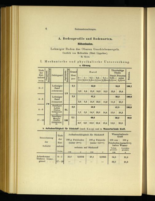 I. Mechanische und physikalische Untersuchung. a. Körnung. %= Thonhaltige| Sand Theile em 7 Staub|Feinstes 2— 1—|0,5—|0,2—/ 0,1—| 0,05—| unter 1mm 0,5mm(,2mm Q,1mm 0,05mm[0,01mm 0,01mm
