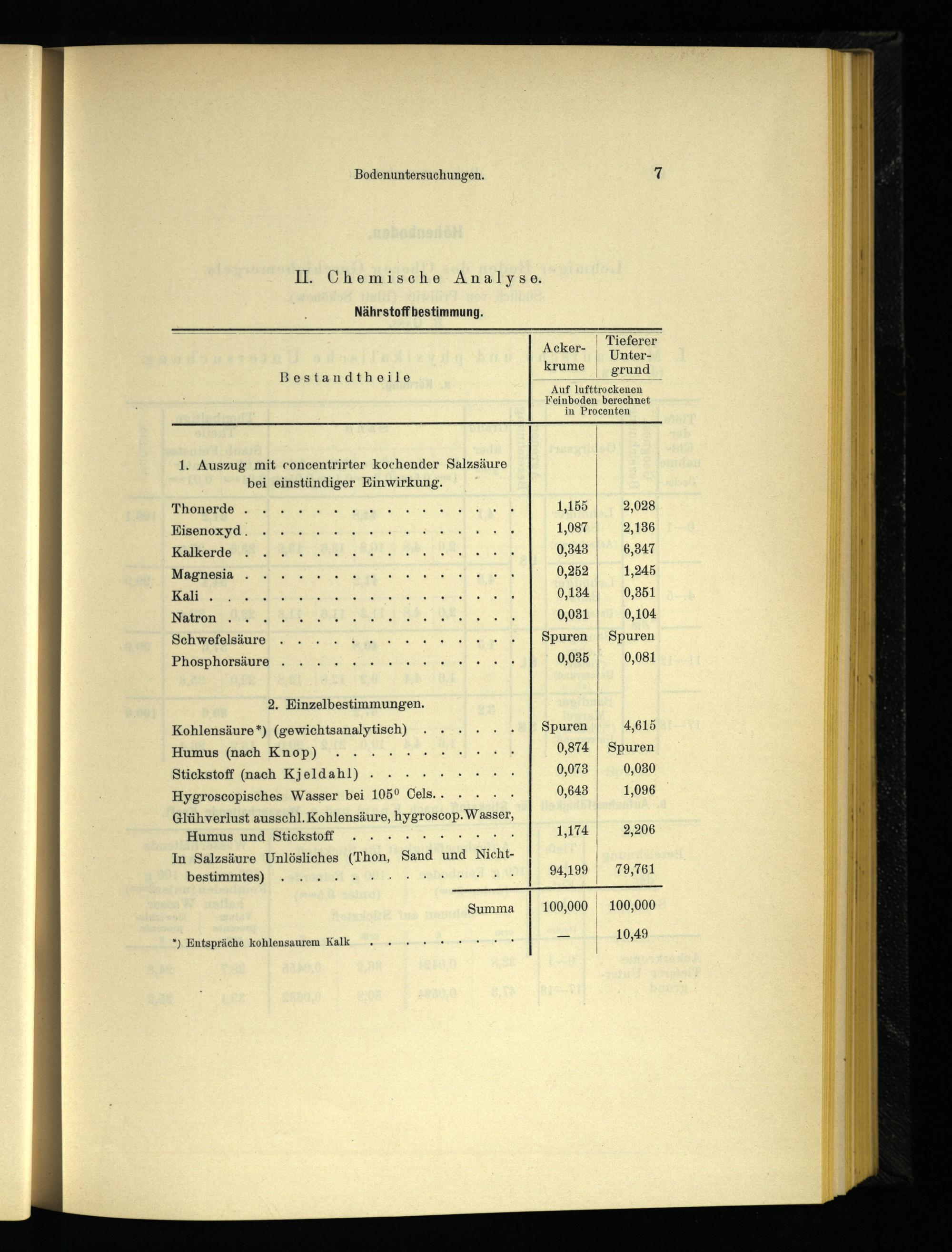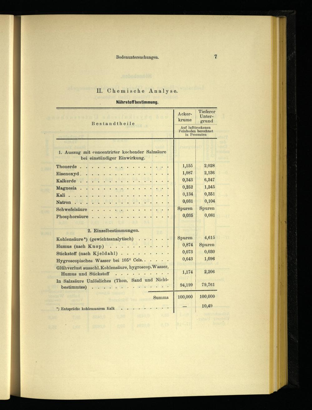 Kohlensäure*)(gewichtsanalytisch)....+ Spuren Humus(nach Knop)......+... 0,874| Stickstoff(nach Kjeldahl)....... 0,078| Hygroscopisches Wasser bei 105° Cels..... 0,6438|
