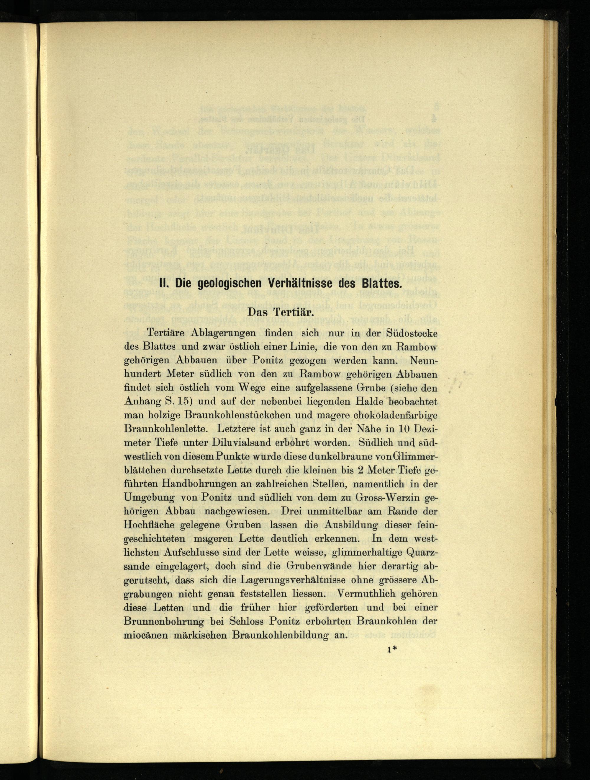 Tertiäre Ablagerungen finden sich nur in der Südostecke des Blattes und zwar östlich einer Linie, die von den zu Rambow gehörigen Abbauen über Ponitz gezogen werden kann. Neunhundert Meter südlich von den zu Rambow gehörigen Abbauen findet sich östlich vom Wege eine aufgelassene Grube(siehe den Anhang S. 15) und auf der nebenbei liegenden Halde’beobachtet man holzige Braunkohlenstückchen und magere choköladenfarbige Braunkohlenlette. Letztere ist auch ganz in der Nähe in 10 Dezimeter Tiefe unter Diluvialsand erbohrt worden. Südlich und südwestlich von diesem Punkte wurde diese dunkelbraune von Glimmerblättchen durchsetzte Lette durch die kleinen bis 2 Meter Tiefe geführten Handbohrungen an zahlreichen Stellen, namentlich in der Umgebung von Ponitz und südlich von. dem zu Gross-Werzin gehörigen Abbau nachgewiesen. Drei unmittelbar am Rande der Hochfläche gelegene Gruben lassen die Ausbildung dieser feingeschichteten mageren Lette deutlich erkennen. In dem westlichsten Aufschlusse sind der Lette weisse, glimmerhaltige Quarzsande eingelagert, doch sind die Grubenwände hier derartig abgerutscht, dass sich die Lagerungsverhältnisse ohne grössere Abgrabungen nicht genau feststellen liessen. Vermuthlich gehören diese Letten und die früher hier geförderten und bei einer Brunnenbohrung bei Schloss Ponitz erbohrten Braunkohlen der miocänen märkischen Braunkohlenbildung an.
