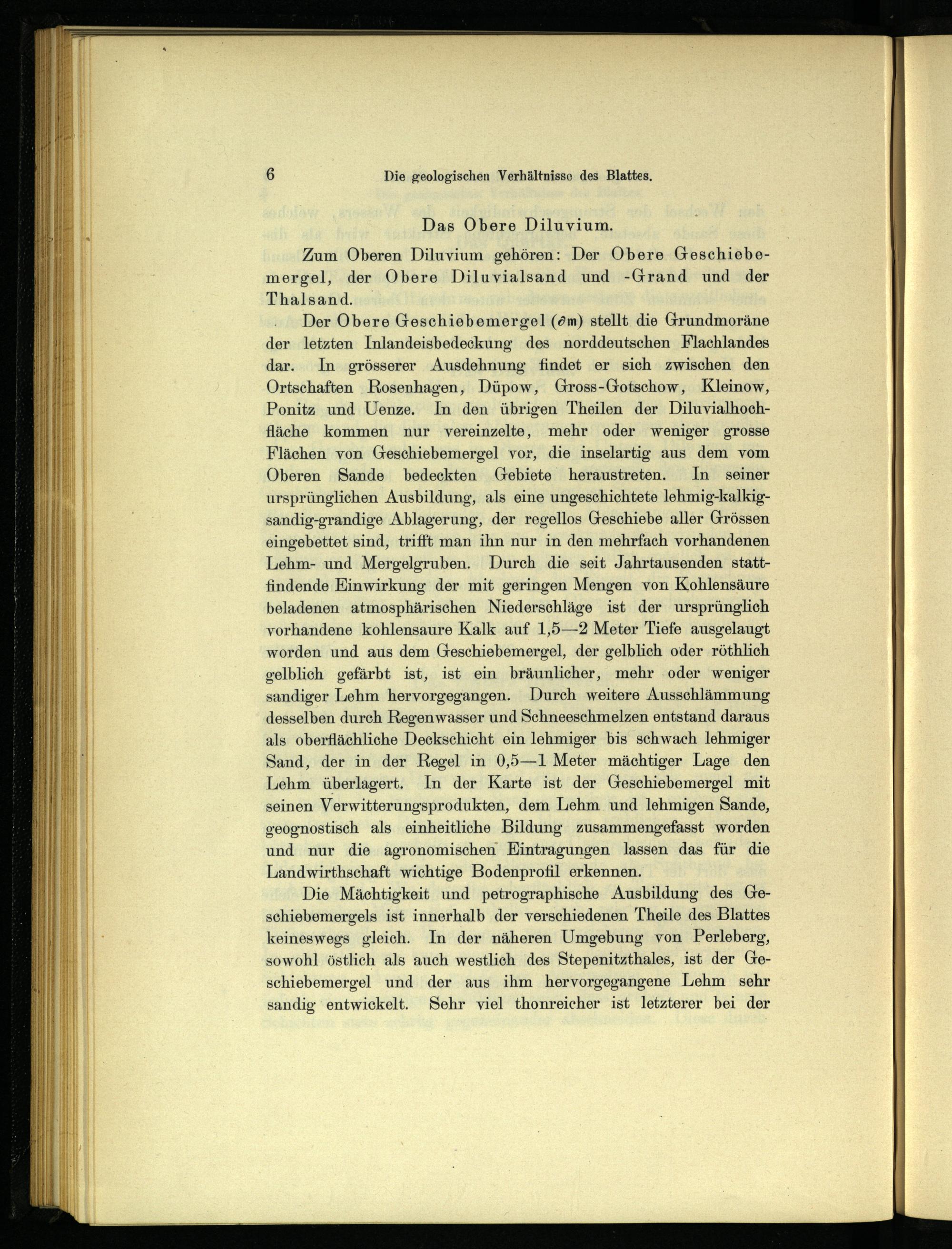 Der Obere Geschiebemergel(öm) stellt die Grundmoräne der letzten Inlandeisbedeckung des norddeutschen Flachlandes dar. In grösserer Ausdehnung findet er sich zwischen den Ortschaften Rosenhagen, Düpow, Gross-Gotschow, Kleinow, Ponitz und Uenze. In den übrigen Theilen der Diluvialhochfläche kommen nur vereinzelte, mehr oder weniger grosse Flächen von Geschiebemergel vor, die inselartig aus dem vom Oberen Sande bedeckten Gebiete heraustreten. In seiner ursprünglichen Ausbildung, als eine ungeschichtete lehmig-kalkigsandig-grandige Ablagerung, der regellos Geschiebe aller Grössen eingebettet sind, trifft man ihn nur in den mehrfach vorhandenen Lehm- und Mergelgruben. Durch die seit Jahrtausenden stattfindende Einwirkung der mit geringen Mengen von Kohlensäure beladenen atmosphärischen Niederschläge ist der ursprünglich vorhandene kohlensaure Kalk auf 1,5—2 Meter Tiefe ausgelaugt worden und aus dem Geschiebemergel, der gelblich oder röthlich gelblich gefärbt ist, ist ein bräunlicher, mehr oder weniger sandiger Lehm hervorgegangen. Durch weitere Ausschlämmung desselben durch Regenwasser und Schneeschmelzen entstand daraus als oberflächliche Deckschicht ein lehmiger bis schwach lehmiger Sand, der in der Regel in 0,5—1 Meter mächtiger Lage den Lehm überlagert. In der Karte ist der Geschiebemergel mit seinen Verwitterungsprodukten, dem Lehm und lehmigen Sande, geognostisch als einheitliche Bildung zusammengefasst worden und nur die agronomischen Eintragungen lassen das für die Landwirthschaft wichtige Bodenprofil erkennen.