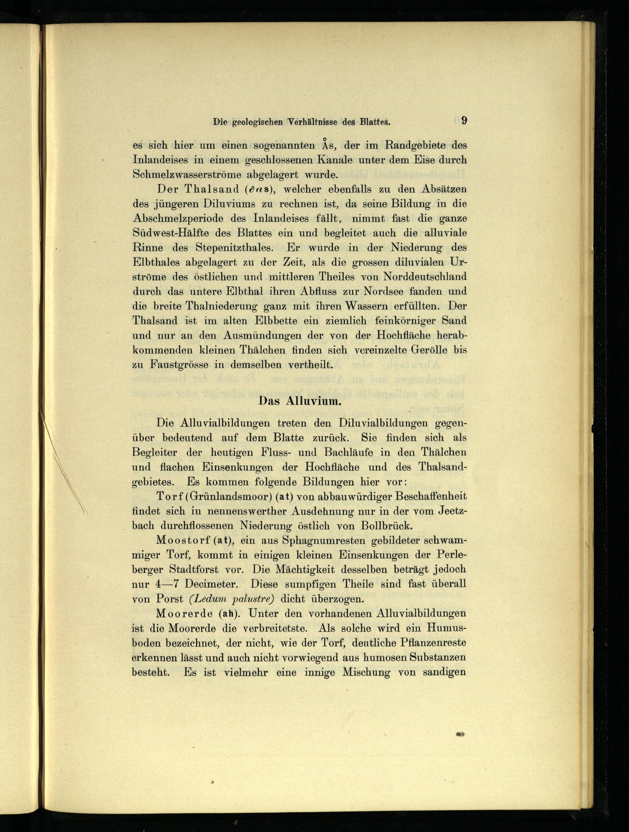 Der Thalsand(ö«s), welcher ebenfalls zu den Absätzen des jüngeren Diluviums zu rechnen ist, da seine Bildung in die Abschmelzperiode des Inlandeises fällt, nimmt fast die ganze Südwest-Hälfte des Blattes ein und begleitet auch die alluviale Rinne des Stepenitzthales. Er wurde in der Niederung des Elbthales abgelagert zu der Zeit, als die grossen diluvialen Urströme des östlichen und. mittleren Theiles von Norddeutschland durch das untere Elbthal ihren Abfluss zur Nordsee fanden und die breite Thalniederung ganz mit ihren Wassern erfüllten. Der Thalsand ist im alten Elbbette ein ziemlich feinkörniger Sand und nur an den Ausmündungen der von der Hochfläche herabkommenden kleinen Thälchen finden sich vereinzelte Gerölle bis zu Faustgrösse in demselben vertheilt.