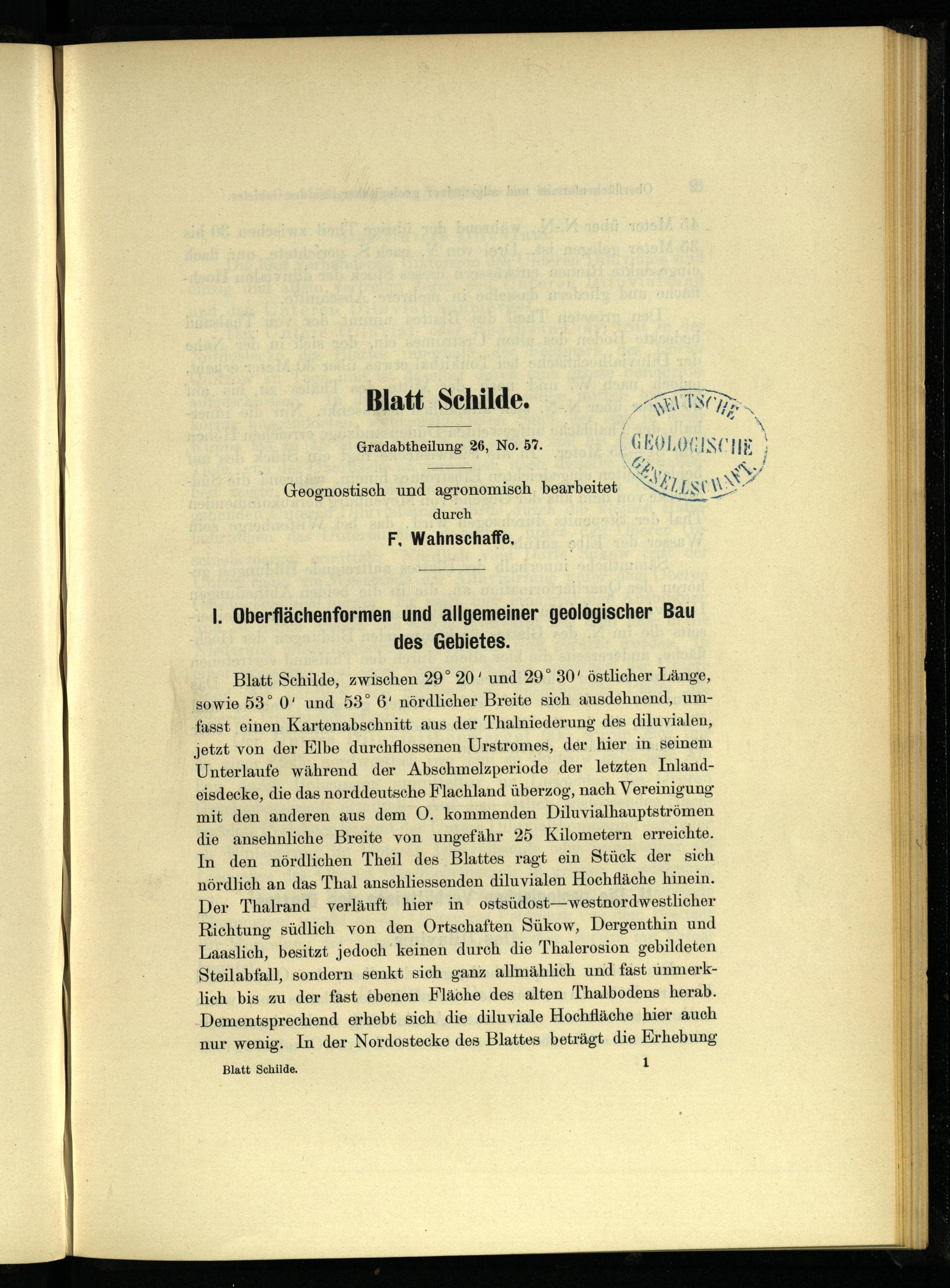 Blatt Schilde, zwischen 29° 20‘ und 29° 30’ östlicher Länge, sowie 53° 0‘ und 53° 6‘ nördlicher Breite sich ausdehnend, umfasst einen Kartenabschnitt aus der Thalniederung des diluvialen, jetzt von der Elbe durchflossenen Urstromes, der hier in seinem Unterlaufe während der Abschmelzperiode der letzten Inlandeisdecke, die das norddeutsche Flachland überzog, nach Vereinigung mit den anderen aus dem O. kommenden Diluvialhauptströmen die ansehnliche Breite von ungefähr 25 Kilometern erreichte. In den nördlichen Theil des Blattes ragt ein Stück der sich nördlich an das Thal anschliessenden diluvialen Hochfläche hinein. Der Thalrand verläuft hier in ostsüdost—westnordwestlicher Richtung südlich von den Ortschaften Sükow, Dergenthin und Laaslich, besitzt jedoch‘ keinen durch die Thalerosion gebildeten Steilabfall, sondern senkt sich ganz allmählich und fast üunmerklich bis zu der fast ebenen Fläche des alten Thalbodens herab. Dementsprechend erhebt sich die diluviale Hochfläche hier auch nur wenig. In der Nordostecke des Blattes beträgt die Erhebung