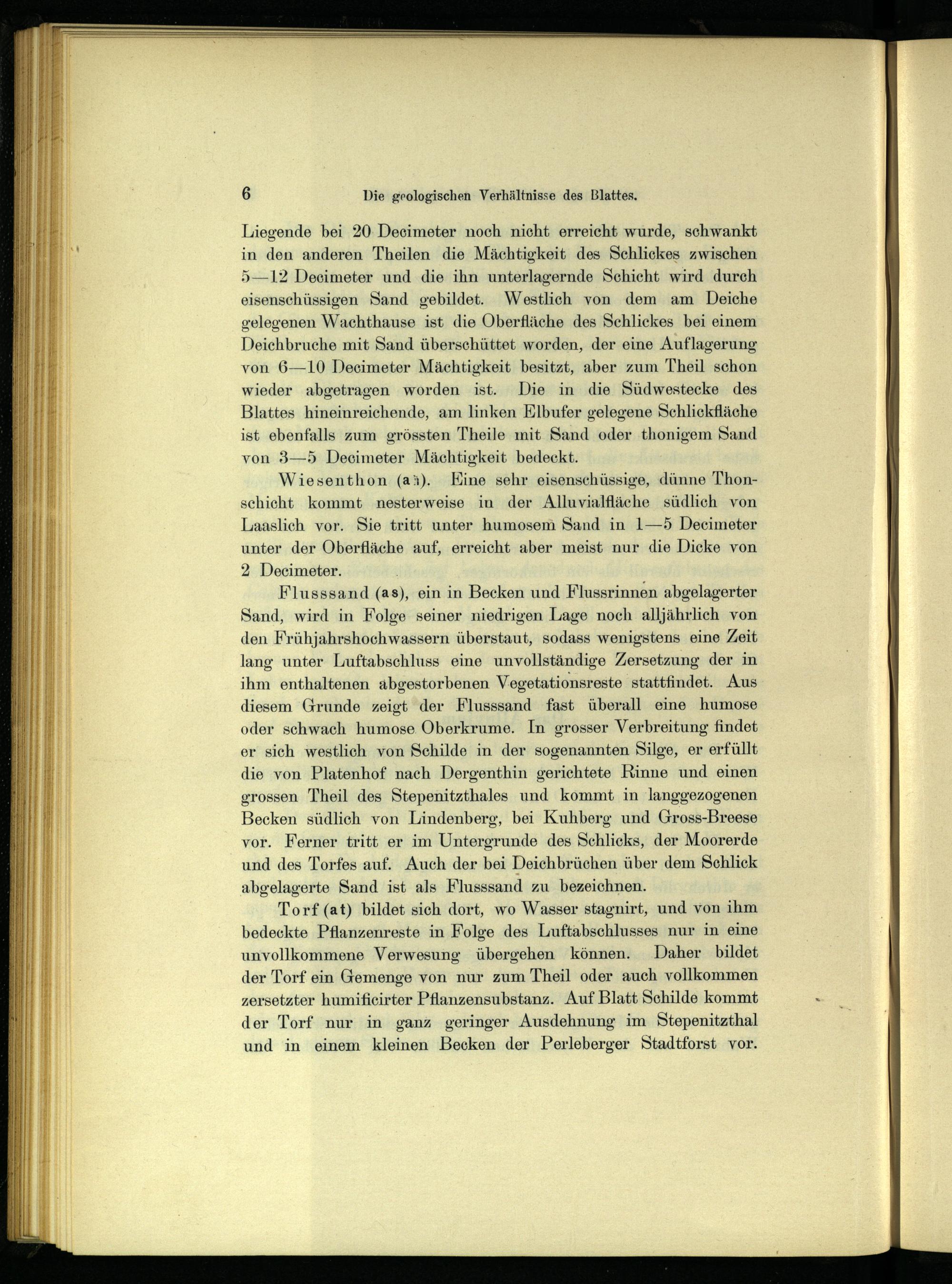 Torf(at) bildet sich dort, wo Wasser stagnirt, und von ihm bedeckte Pflanzenreste in Folge des Luftabschlusses nur in eine unvollkommene Verwesung übergehen können. Daher bildet der Torf ein Gemenge von nur zum Theil oder auch vollkommen zersetzter humifieirter Pflanzensubstanz. Auf Blatt Schilde kommt der Torf nur in ganz geringer Ausdehnung im Stepenitzthal und in einem kleinen Becken der Perleberger Stadtforst vor.