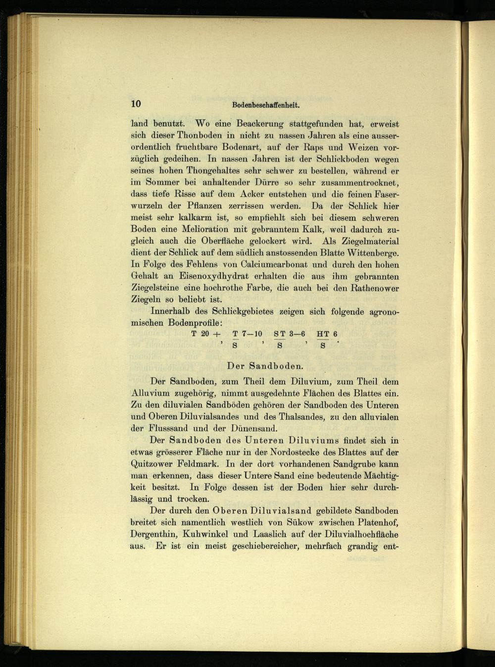 land benutzt. Wo eine Beackerung stattgefunden hat, erweist sich dieser Thonboden in nicht zu nassen Jahren als eine ausserordentlich fruchtbare Bodenart, auf der Raps und Weizen vorzüglich gedeihen. In nassen Jahren ist der Schlickboden wegen seines hohen Thongehaltes sehr schwer zu bestellen, während er im Sommer bei anhaltender Dürre so sehr zusammentrocknet, dass tiefe Risse auf dem Acker entstehen und die feinen Faserwurzeln der Pflanzen zerrissen werden. Da der Schlick hier meist sehr kalkarm ist, so empfiehlt sich bei diesem schweren Boden eine Melioration mit gebranntem Kalk, weil dadurch zugleich auch die Oberfläche gelockert wird. Als Ziegelmaterial dient der Schlick auf dem südlich anstossenden Blatte Wittenberge . In Folge des Fehlens von Calciumcarbonat und durch den hohen Gehalt an Eisenoxydhydrat erhalten die aus ihm gebrannten Ziegelsteine eine hochrothe Farbe, die auch bei den Rathenower Ziegeln so beliebt ist.