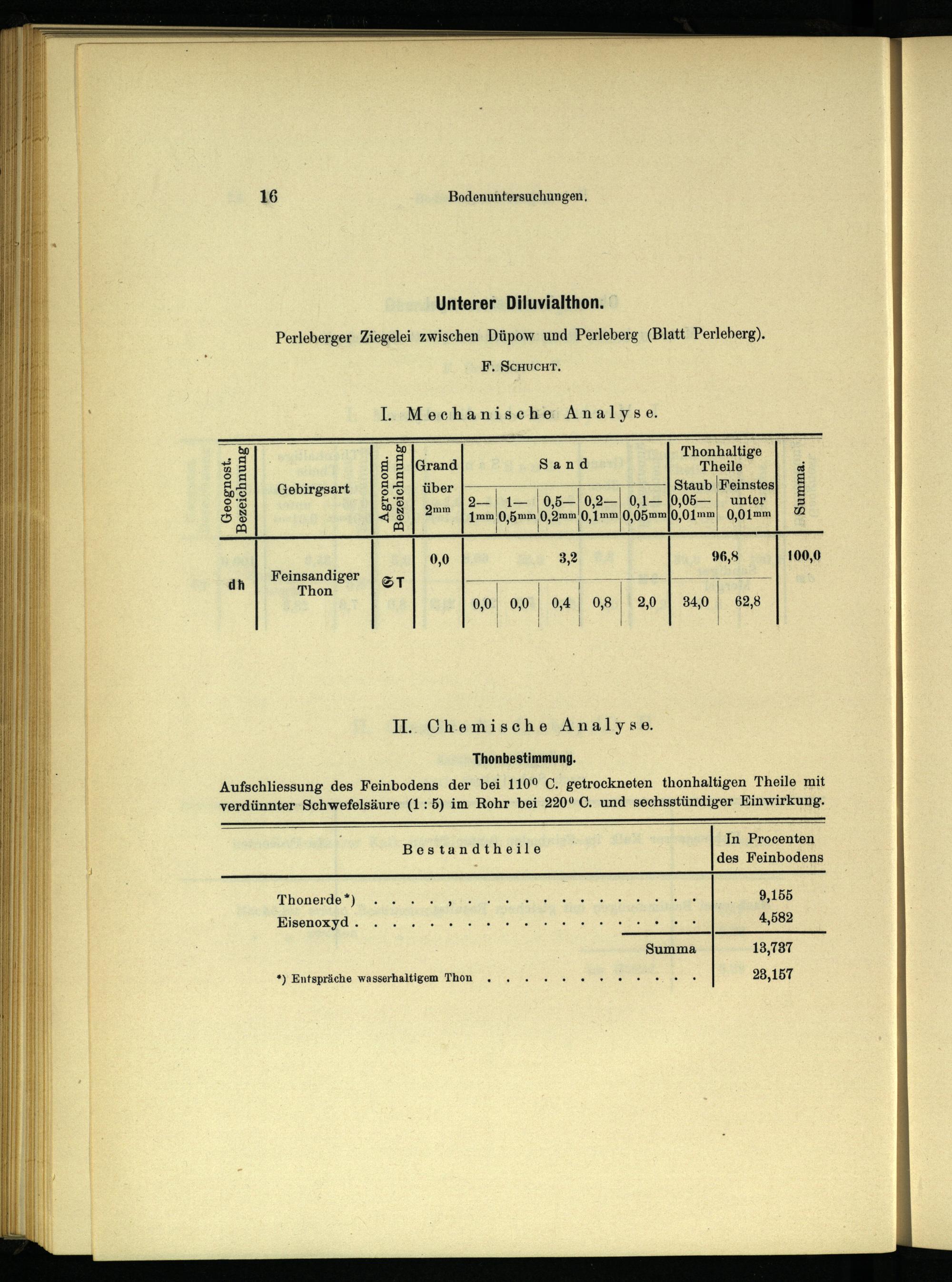 Aufschliessung des Feinbodens der bei 110° C. getrockneten thonhaltigen Theile mit verdünnter Schwefelsäure(1:5) im Rohr bei 220° C. und sechsstündiger Einwirkung.