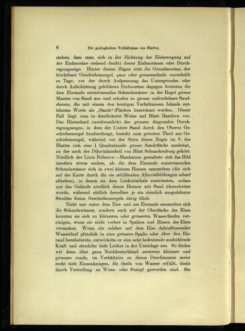 stehen; dass man sich in der Richtung der Eisbewegung auf der Endmoräne stehend denkt) dieser Endmoränen oder Durchragungszüge. Hinter diesen Zügen tritt die Grundmoräne, der fruchtbare Geschiebemergel, ganz oder grösstentheils unverhüllt zu Tage; vor der durch Aufpressung des Untergrundes oder durch Aufschüttung gebildeten Endmoräne dagegen breiteten die dem KEisrande entströmenden Schmelzwässer in der Regel grosse Massen von Sand aus und schufen so grosse unfruchtbare Sandebenen, die mit einem den heutigen Verhältnissen Islands entlehnten Worte als„Sandr“-Flächen bezeichnet werden. Dieser Fall liegt nun in deutlichster Weise auf Blatt Rambow vor. Das Hinterland(nordwestlich) des grossen diagonalen Durchragungszuges, in dem der Untere Sand durch den Oberen Geschiebemergel hindurchragt, besteht zum grössten Cheil aus Geschiebemergel, während vor der Stirn dieses Zuges im S. des Blattes sich eine 1 Quadratmeile grosse Sandrfläche ausdehnt, zu der auch der Diluvialantheil von Blatt Schnackenburg gehört. Nördlich der Linie Boberow—-Mankmuss gestaltete sich das Bild insofern etwas anders, als die dem KEisrande entströmenden Schmelzwässer sich in zwei kleinen Rinnen sammelten(die sich auf der Karte durch die sie erfüllenden Alluvialbildungen scharf abheben), in denen sie dem Löcknitzthale zuströmten, sodass nur das Gelände nördlich dieser Rinnen mit Sand überschüttet wurde, während südlich derselben je ein ziemlich ausgedehnter Streifen freien Geschiebemergels übrig blieb.