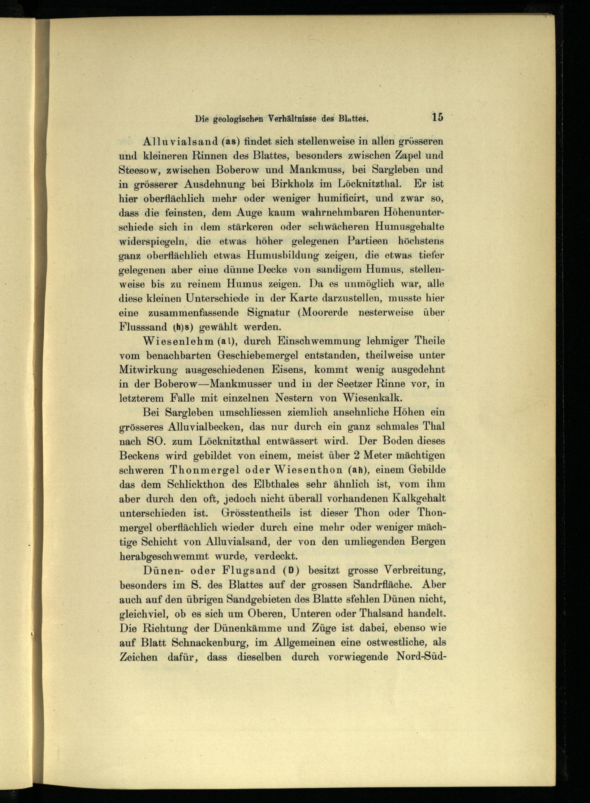 Bei Sargleben umschliessen ziemlich ansehnliche Höhen ein grösseres Alluvialbecken, das nur durch ein ganz schmales Thal nach SO. zum Löcknitzthal entwässert wird. Der Boden dieses Beckens wird gebildet von einem, meist über 2 Meter mächtigen schweren Thonmergel oder Wiesenthon(ah), einem Gebilde das dem Schlicekthon des Elbthales sehr ähnlich ist, vom ihm aber durch den oft, jedoch nicht überall vorhandenen Kalkgehalt unterschieden ist. Grösstentheils ist dieser Thon oder Thonmergel oberflächlich wieder durch eine mehr oder weniger mächtige Schicht von Alluvialsand, der von den umliegenden Bergen herabgeschwemmt wurde, verdeckt.