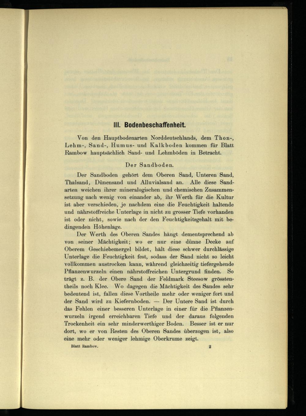 Von den Hauptbodenarten Norddeutschlands, dem Thon-, Lehm-, Sand-, Humus- und Kalkboden kommen für Blatt Rambow hauptsächlich Sand- und Lehmböden in Betracht.