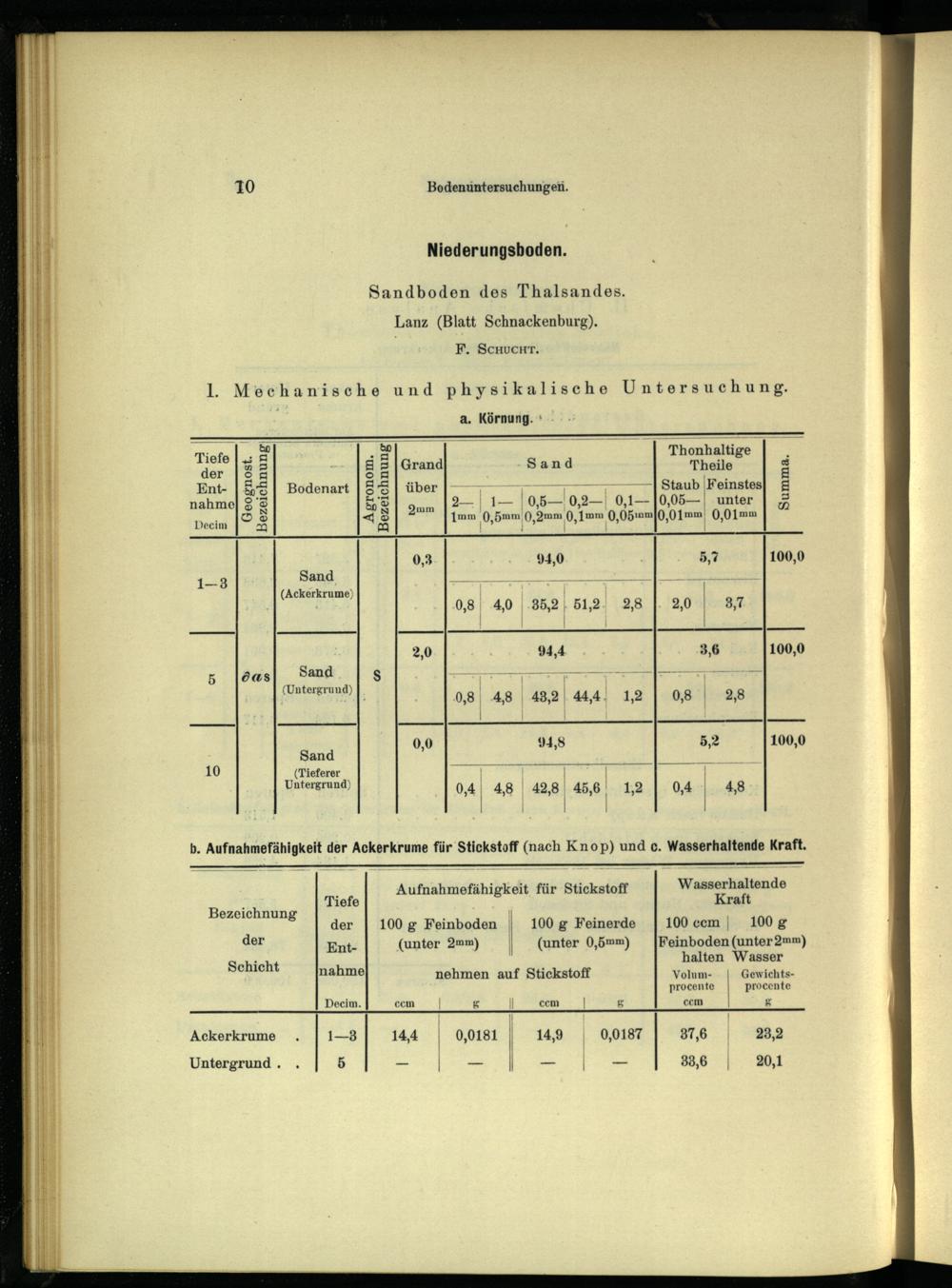 der Ent-(unter 2mm)(unter 0,5mm)|Feinboden(unter 2mm) Schicht. halten Wasser nahme nehmen auf Stickstoff Volum -| Gewichtsprocente procente Decim. ccm|| g ccm| g