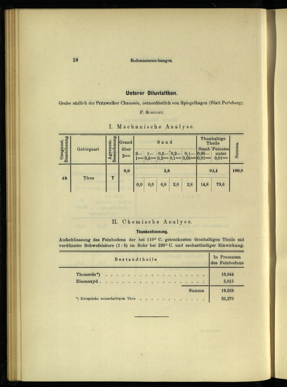 Aufschliessung des Feinbodens der bei 110° C. getrockneten thonhaltigen Theile mit verdünnter Schwefelsäure(1: 5) im Rohr bei 220° C, und sechsstündiger Einwirkung.