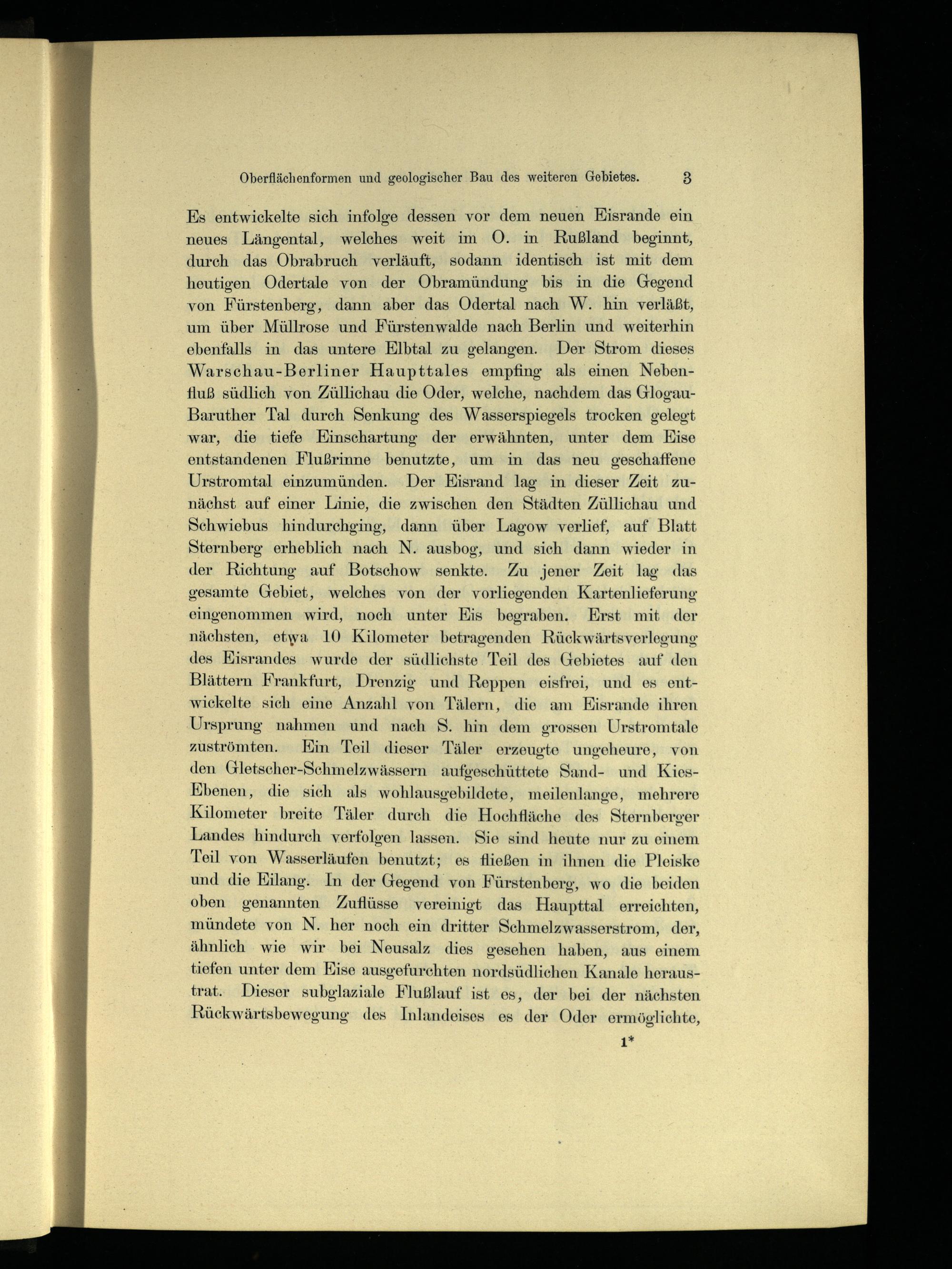 Es entwickelte sich infolge dessen vor dem neuen Eisrande ein neues Längental, welches weit im O. in Rußland beginnt, durch das Obrabruch verläuft, sodann identisch ist mit dem heutigen Odertale von der Obramündung bis in die Gegend von Fürstenberg, dann aber das Odertal nach W. hin verläßt, um über Müllrose und Fürstenwalde nach Berlin und weiterhin ebenfalls in das untere Elbtal zu gelangen. Der Strom dieses Warschau -Berliner Haupttales empfing als einen Nebenfluß südlich von Züllichau die Oder, welche, nachdem das GlogauBaruther Tal durch Senkung des Wasserspiegels trocken gelegt war, die tiefe Einschartung der erwähnten, unter dem HKise entstandenen Flußrinne benutzte, um in das neu geschaffene Urstromtal einzumünden. Der Eisrand lag in dieser Zeit zunächst auf einer Linie, die zwischen den Städten Züllichau und Schwiebus hindurchging, dann über Lagow verlief, auf Blatt Sternberg erheblich nach N. ausbog, und sich dann wieder in der Richtung auf Botschow senkte. Zu jener Zeit lag das gesamte Gebiet, welches von der vorliegenden Kartenlieferung eingenommen wird, noch unter Eis begraben. Erst mit der nächsten, etwa 10 Kilometer betragenden Rückwärtsverlegung des Eisrandes wurde der südlichste Teil des Gebietes auf den Blättern Frankfurt , Drenzig und Reppen eisfrei, und es entwickelte sich eine Anzahl von Tälern, die am KEisrande ihren Ursprung nahmen und nach S. hin dem grossen Urstromtale zuströmten. Kin Teil dieser Täler erzeugte ungeheure, von den Gletscher-Schmelzwässern aufgeschüttete Sand- und KiesEbenen, die sich als wohlausgebildete, meilenlange, mehrere Kilometer breite Täler durch die Hochfläche des Sternberger Landes hindurch verfolgen lassen. Sie sind heute nur zu einem Teil von Wasserläufen benutzt; es fließen in ihnen die Pleiske und die Eilang. In der Gegend von Fürstenberg, wo die beiden oben genannten Zuflüsse vereinigt das Haupttal erreichten, mündete von N. her noch ein dritter Schmelzwasserstrom, der, ähnlich wie wir bei Neusalz dies gesehen haben, aus einem tiefen unter dem Eise ausgefurchten nordsüdlichen Kanale heraustrat. Dieser subglaziale Flußlauf ist es, der bei der nächsten Rückwärtsbewegung des Inlandeises es der Oder ermöglichte,