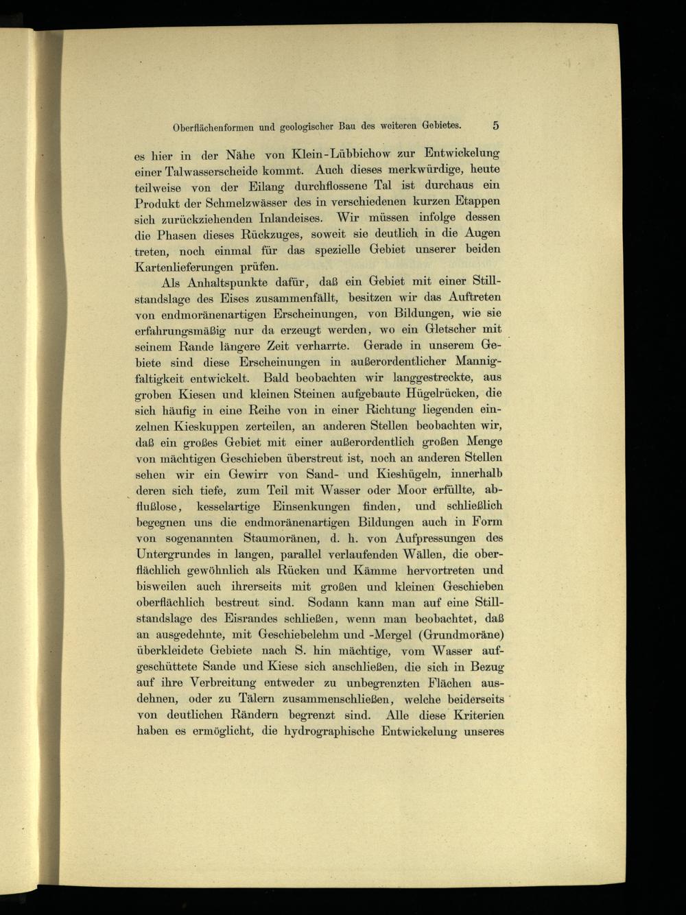 es hier in der Nähe von Klein-Lübbichow zur Entwickelung einer Talwasserscheide kommt. Auch dieses merkwürdige, heute teilweise von der HEilang durchflossene Tal ist durchaus ein Produkt der Schmelzwässer des in verschiedenen kurzen Etappen sich zurückziehenden Inlandeises. Wir müssen infolge dessen die Phasen dieses Rückzuges, soweit sie deutlich in die Augen treten, noch einmal für das spezielle Gebiet unserer beiden Kartenlieferungen prüfen.