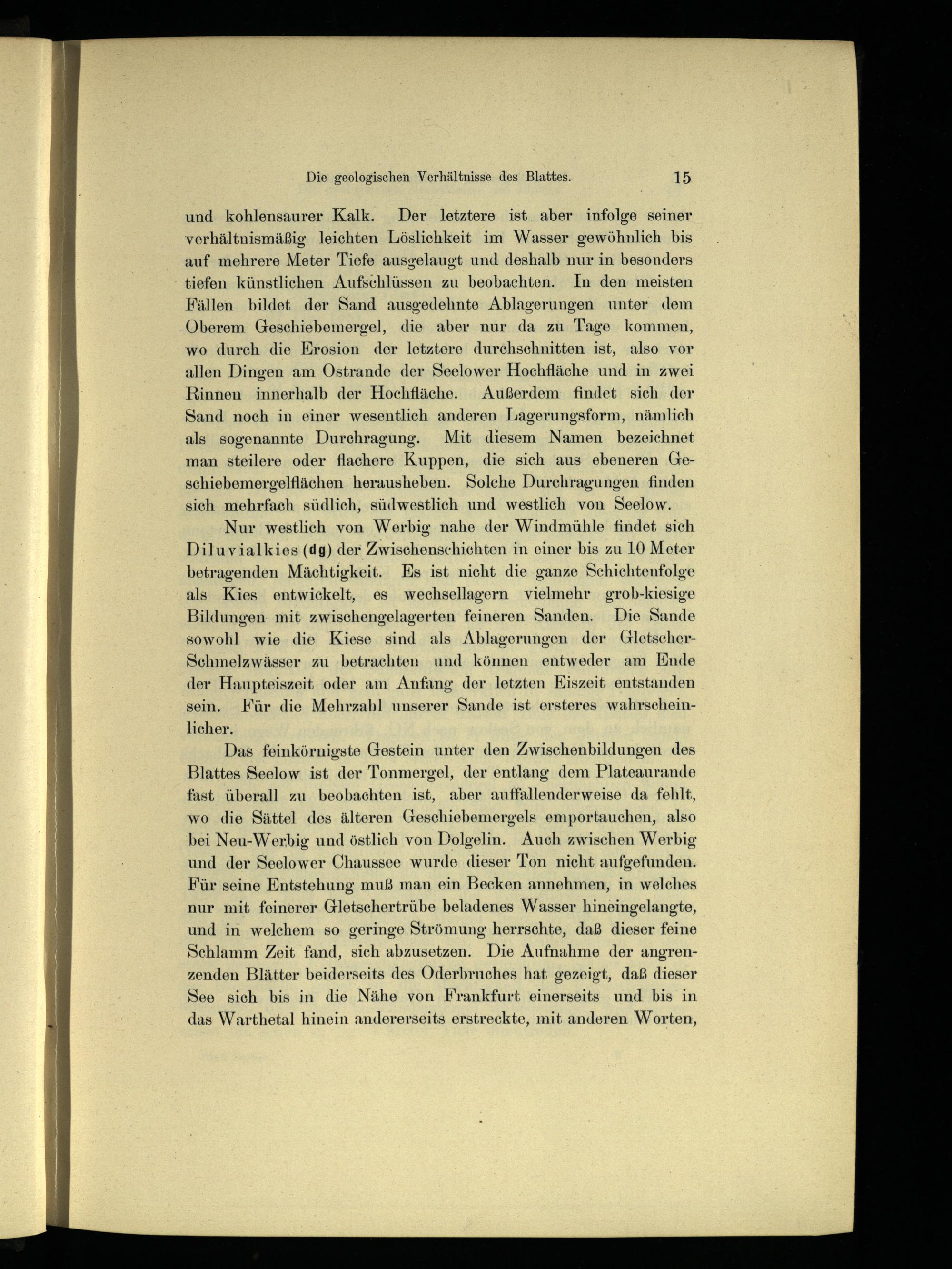 Das feinkörnigste Gestein unter den Zwischenbildungen des Blattes Seelow ist der Tonmergel, der entlang dem Plateaurande fast überall zu beobachten ist, aber auffallenderweise da fehlt, wo die Sättel des älteren Geschiebemergels emportauchen, also bei Neu-Werbig und östlich von Dolgelin. Auch zwischen Werbig und der Seelower Chaussee wurde dieser Ton nicht aufgefunden. Für seine Entstehung muß man ein Becken annehmen, in welches nur mit feinerer Gletschertrübe beladenes Wasser hineingelangte, und in welchem so geringe Strömung herrschte, daß dieser feine Schlamm Zeit fand, sich abzusetzen. Die Aufnahme der angrenzenden Blätter beiderseits des Oderbruches hat gezeigt, daß dieser See sich bis in die Nähe von Frankfurt einerseits und bis in das Warthetal hinein andererseits erstreckte, mit anderen Worten,