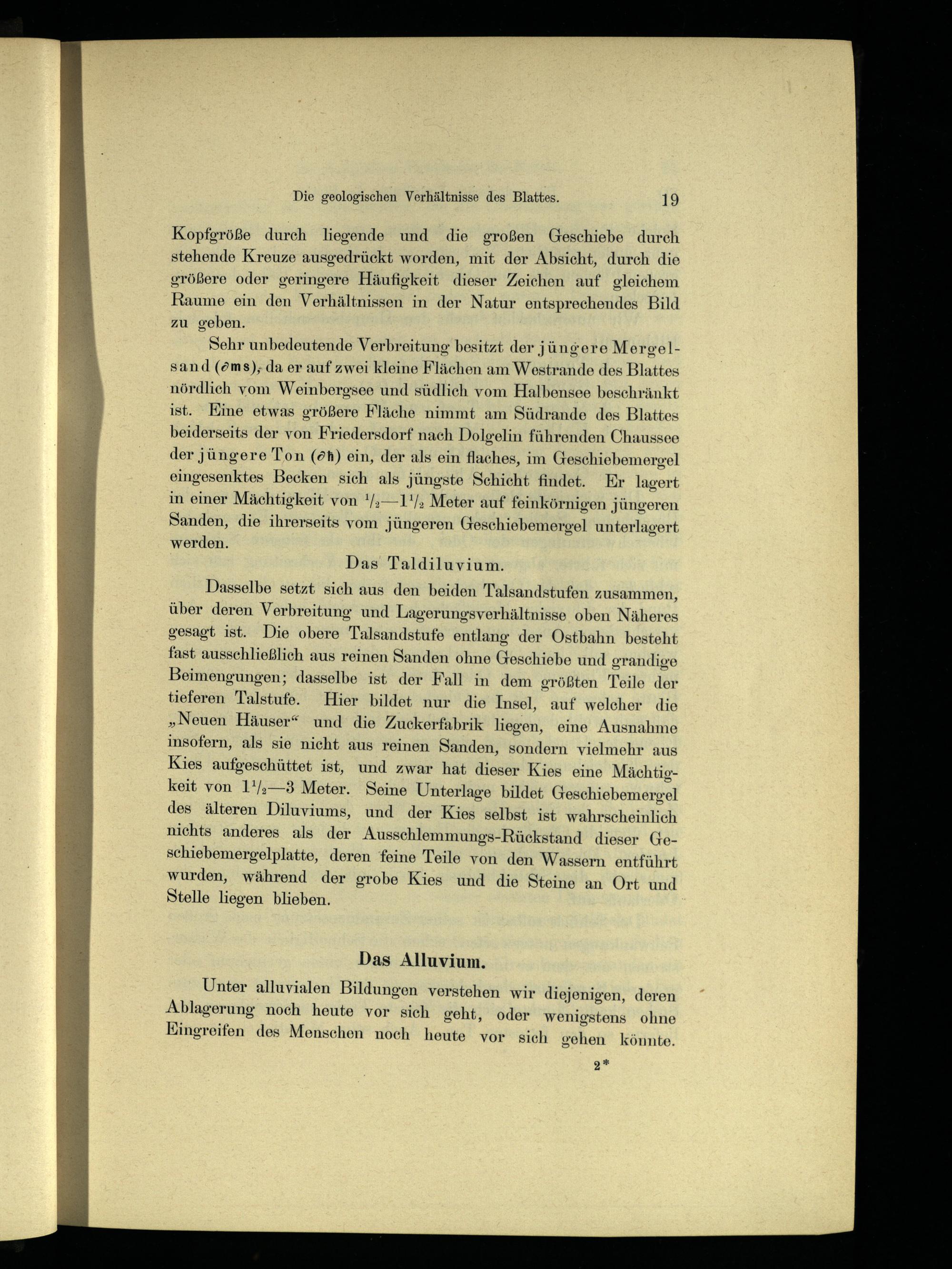 Dasselbe setzt sich aus den beiden Talsandstufen zusammen, über deren Verbreitung und Lagerungsverhältnisse oben Näheres gesagt ist. Die obere Talsandstufe entlang der Ostbahn besteht fast ausschließlich aus reinen Sanden ohne Geschiebe und grandige Beimengungen; dasselbe ist der Fall in dem größten Teile der tieferen Talstufe. Hier bildet nur die Insel, auf welcher die „Neuen Häuser“ und die Zuckerfabrik liegen, eine Ausnahme insofern, als sie nicht aus reinen Sanden, sondern vielmehr aus Kies aufgeschüttet ist, und zwar hat dieser Kies eine Mächtigkeit von 1'/;—83 Meter. Seine Unterlage bildet Geschiebemergel des älteren Diluviums, und der Kies selbst ist wahrscheinlich nichts anderes als der Ausschlemmungs-Rückstand dieser Geschiebemergelplatte, deren feine Teile von den Wassern entführt