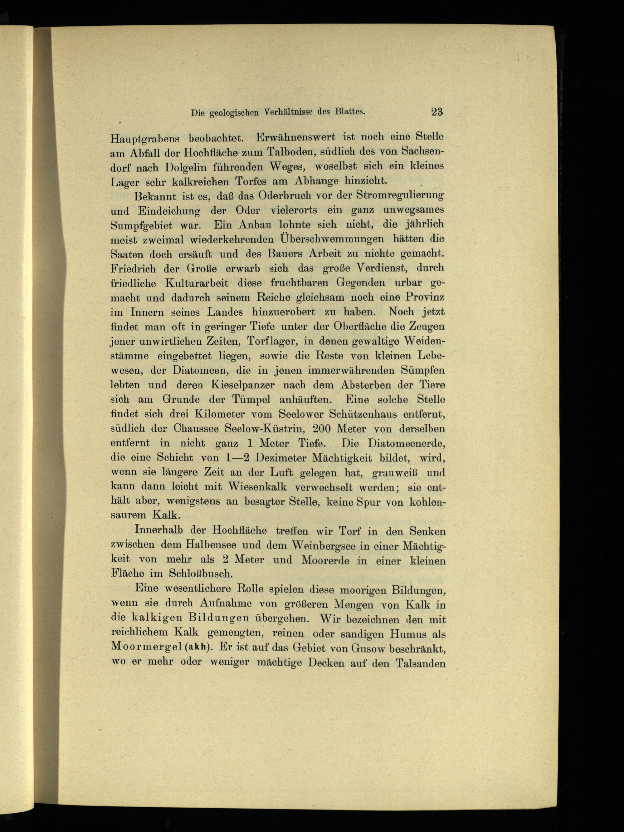 Hauptgrabens beobachtet. Erwähnenswert ist noch eine Stelle am Abfall der Hochfläche zum Talboden, südlich des von Sachsendorf nach Dolgelin führenden Weges, woselbst sich ein kleines Lager sehr kalkreichen Torfes am Abhange hinzieht.