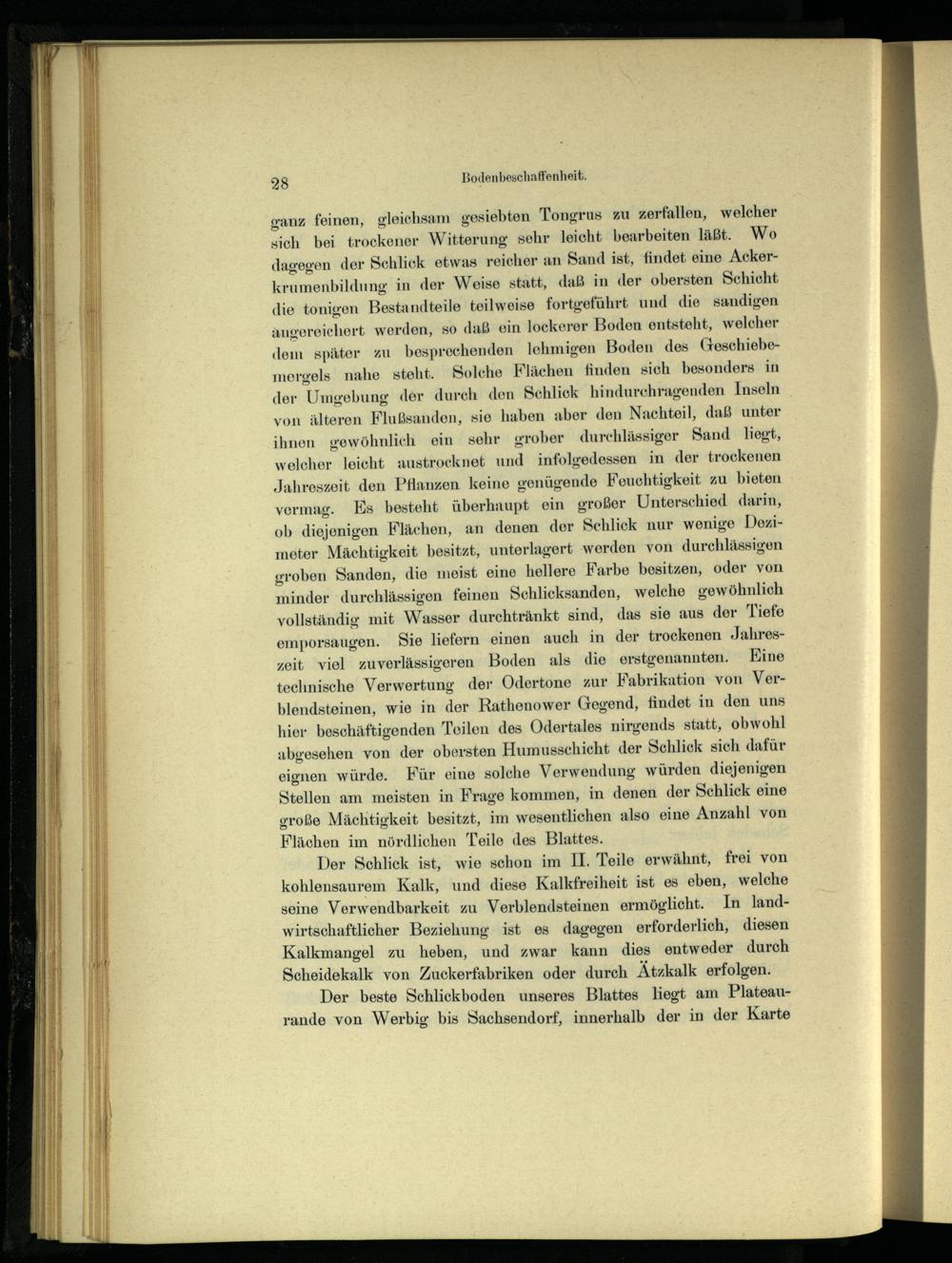 ganz feinen, gleichsam gesiebten Tongrus zu zerfallen, welcher sich bei trockener Witterung sehr leicht bearbeiten läßt. Wo dagegen der Schlick etwas reicher an Sand ist, findet eine Ackerkrumenbildung in der Weise statt, daß in der obersten Schicht die tonigen Bestandteile teilweise fortgeführt und die sandigen angereichert werden, so daß ein lockerer Boden entsteht, welcher dem später zu besprechenden lehmigen Boden des Geschiebemergels nahe steht. Solche Flächen finden sich besonders in der Umgebung der durch den Schliek hindurchragenden Inseln von älteren Flußsanden, sie haben aber den Nachteil, daß unter ihnen gewöhnlich ein sehr grober durchlässiger Sand liegt, welcher leicht austrocknet und infolgedessen in der trockenen Jahreszeit den Pflanzen keine genügende Feuchtigkeit zu bieten vermag. Es besteht überhaupt ein großer Unterschied darin, ob diejenigen Flächen, an denen der Schliek nur wenige Dezimeter Mächtigkeit besitzt, unterlagert werden von durchlässigen groben Sanden, die meist eine hellere Farbe besitzen, oder von minder durchlässigen feinen Schliceksanden, welche gewöhnlich vollständig mit Wasser durchtränkt sind, das sie aus der Tiefe emporsaugen. Sie liefern einen auch in der trockenen Jahreszeit viel zuverlässigeren Boden als die erstgenannten. Eine technische Verwertung der Odertone zur Fabrikation von Verblendsteinen, wie in der Rathenower Gegend, findet in den uns hier beschäftigenden Teilen des Odertales nirgends statt, obwohl abgesehen von der obersten Humusschicht der Schlick sich dafür eignen würde. Für eine solche Verwendung würden diejenigen Stellen am meisten in Frage kommen, in denen der Schlick eine große Mächtigkeit besitzt, im wesentlichen also eine Anzahl von Flächen im nördlichen"Teile des Blattes.