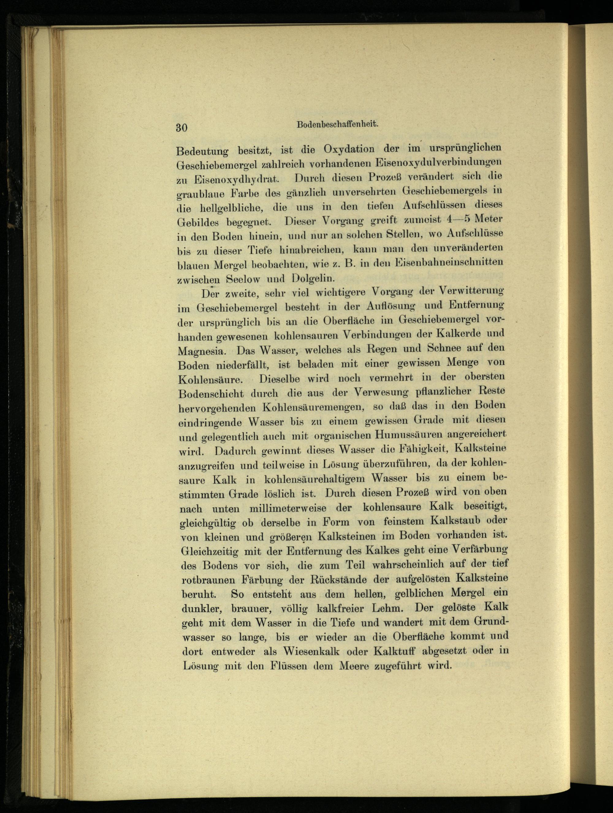 Der zweite, sehr viel wichtigere Vorgang der Verwitterung im Geschiebemergel besteht in der Auflösung und Entfernung der ursprünglich bis an die Oberfläche im Geschiebemergel vorhanden gewesenen kohlensauren Verbindungen der Kalkerde und Magnesia. Das Wasser, welches als Regen und Schnee auf den Boden niederfällt, ist beladen mit einer gewissen Menge von Kohlensäure. : Dieselbe wird noch vermehrt in der obersten Bodenschicht durch die aus der Verwesung pflanzlicher Reste hervorgehenden Kohlensäuremengen, so daß das in den Boden eindringende Wasser bis zu einem gewissen Grade mit diesen und gelegentlich auch mit organischen Humussäuren angereichert wird. Dadurch gewinnt dieses Wasser die Fähigkeit, Kalksteine anzugreifen und teilweise in Lösung überzuführen, da der kohlensaure Kalk in kohlensäurehaltigem Wasser bis zu einem bestimmten Grade löslich ist. Durch diesen Prozeß wird von oben nach unten millimeterweise der kohlensaure Kalk beseitigt, gleichgültig ob derselbe in Form von feinstem Kalkstaub oder von kleinen und größeren Kalksteinen im Boden vorhanden ist. Gleichzeitig mit der Entfernung des Kalkes geht eine Verfärbung des Bodens vor sich, die zum Teil wahrscheinlich auf der tief rotbraunen Färbung der Rückstände der aufgelösten Kalksteine beruht. So entsteht aus dem hellen, gelblichen Mergel ein dunkler, brauner, völlig kalkfreier Lehm. Der gelöste Kalk geht mit dem Wasser in die Tiefe und wandert mit dem Grundwasser so lange, bis er wieder an die Oberfläche kommt und dort entweder als Wiesenkalk oder Kalktuff abgesetzt oder in Lösung mit den Flüssen dem Meere zugeführt wird.