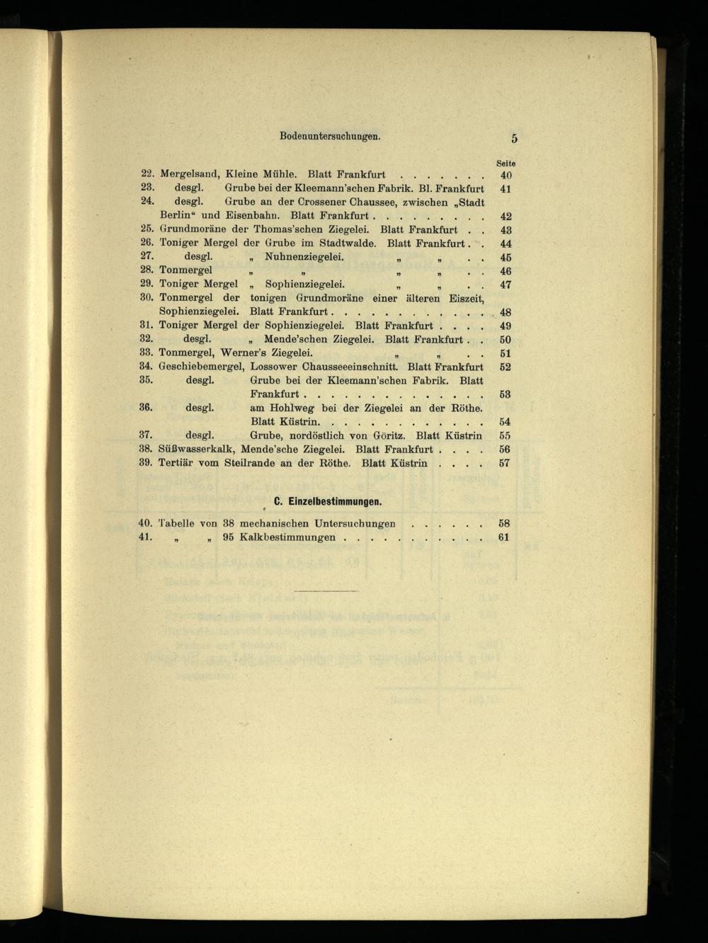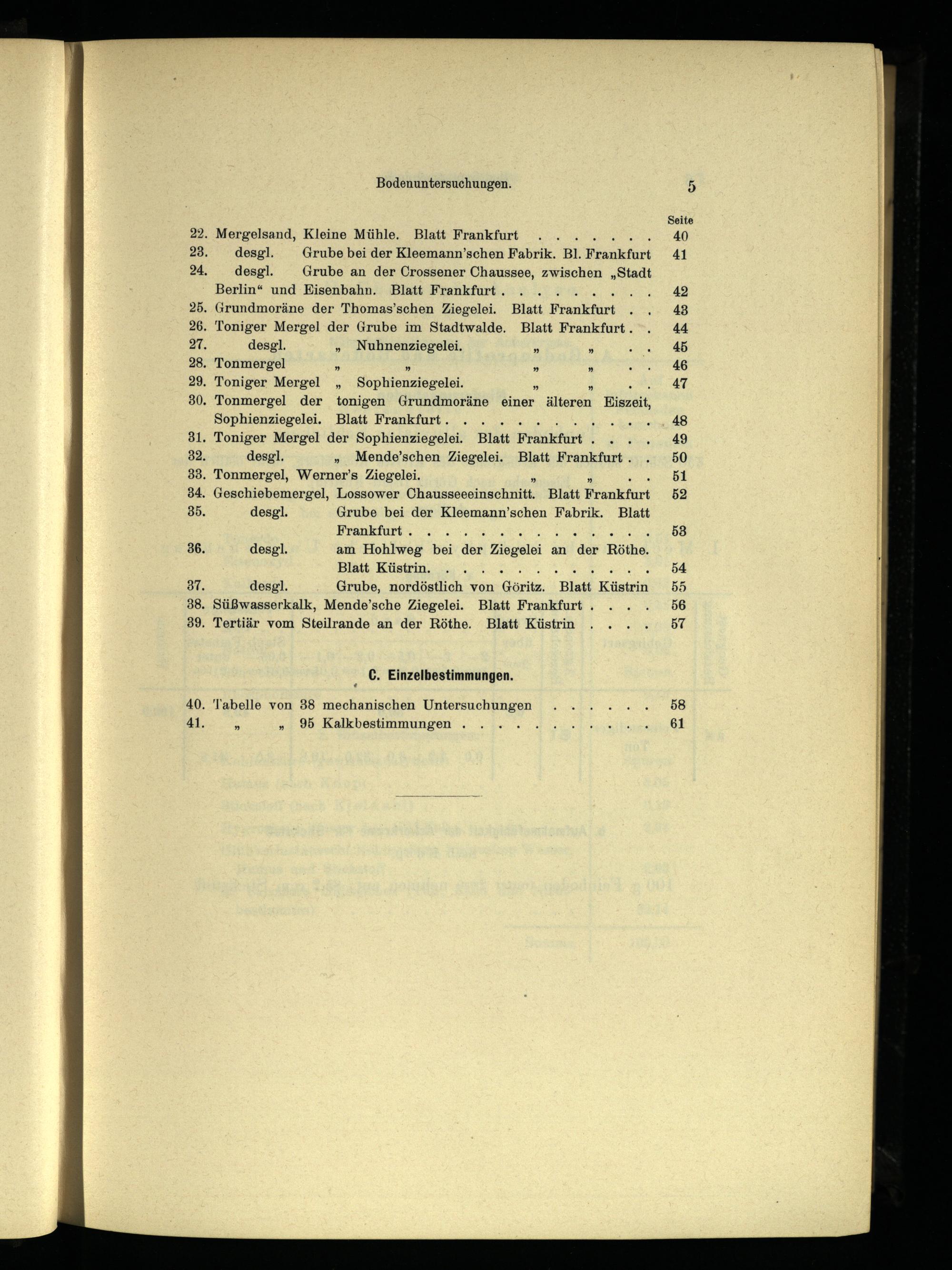 . Mergelsand, Kleine Mühle. Blatt Frankfurt desgl. Grube bei der Kleemann’schen Fabrik. Bl. Frankfurt desgl. Grube an der Crossener Chaussee, zwischen„Stadt Berlin “ und Eisenbahn . Blatt Frankfurt . kam . Grundmoräne der Thomas’schen Ziegelei. Blatt Frankfurt . Toniger Mergel der Grube im Stadtwalde. Blatt Frankfurt . desgl.„ Nuhnenziegelei,”; . Tonmergel ”%” . Toniger Mergel„ Sophienziegelei.” 5 . Tonmergel der tonigen Grundmoräne einer älteren Eiszeit, Sophienziegelei. Blatt Frankfurt . en ‚ Toniger Mergel der Sophienziegelei. Blatt Frankfurt . desgl.„ Mende’schen Ziegelei. Blatt Frankfurt . . Tonmergel, Werner’s Ziegelei. N Win . Geschiebemergel, Lossower Chausseeeinschnitt. Blatt Frankfurt desgl. Grube bei der Kleemann’schen Fabrik. Blatt Frankfurt . desgl. am Hohlweg bei der Ziegelei an"der Röthe. Blatt Küstrin. ; ER Wen desgl. Grube, nordöstlich von Göritz."Blatt Küstrin . Süßwasserkalk, Mende’sche Ziegelei. Blatt Frankfurt . . Tertiär vom Steilrande an der Röthe. Blatt Küstrin