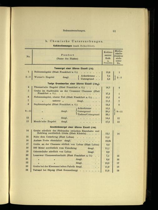 Nahe dem Unterkrug(Blatt Lebus ) Andere Probe ebendaher desgl. Ra Grube an der Chaussee südlich von Lebus (Blatt Lebus ) 500 Meter nordöstlich vom Unterkrug desgl. Odersteilufer nördlich von Lebus desgl. Lossower Chausseeeinschnitt(Blatt Frankfurt a. O.) »» desgl. »» desgl. Grube bei der Kleemann’schen Fabrik desgl. Talrand bei Säpzig(Blatt Sonnenburg)