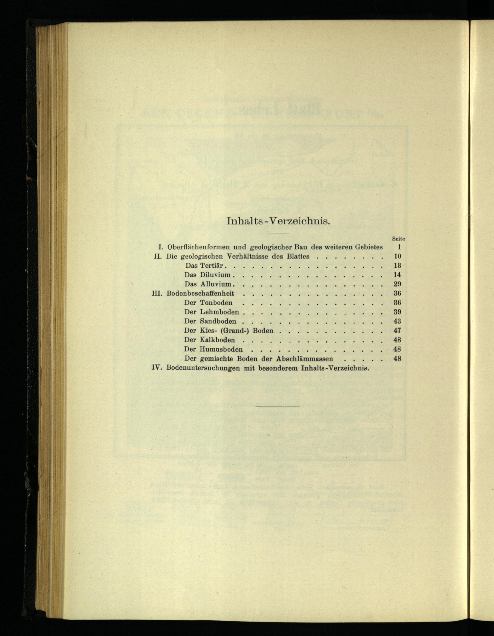 I. Oberflächenformen und geologischer Bau des weiteren Gebietes JI. Die geologischen Verhältnisse des Blattes Das Tertiär. Das Diluvium. Das Alluvium. III. Bodenbeschaffenheit Der Tonboden Der Lehmboden. Der Sandboden. Der Kies-(Grand-) Boden Der Kalkboden Der Humusboden. Der gemischte Boden der Abschlämmassen IV. Bodenuntersuchungen mit besonderem Inhalts- Verzeichnis.