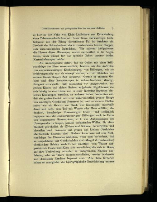 Als Anhaltspunkte dafür, daß ein Gebiet mit einer Stillstandslage des Eises zusammenfällt, besitzen wir das Auftreten von endmoränenartigen Erscheinungen, von Bildungen, wie sie erfahrungsmäßig nur da erzeugt werden, wo ein Gletscher mit seinem Rande längere Zeit verharrte. Gerade in unserem Gebiete sind diese Erscheinungen in außerordentlicher Mannigfaltigkeit entwickelt. Bald beobachten wir langgestreckte, aus groben Kiesen und kleinen Steinen aufgebaute Hügelrücken, die sich häufig in eine Reihe von in einer Richtung liegenden einzelnen Kieskuppen zerteilen, an anderen Stellen beobachten wir, daß ein großes Gebiet mit einer außerordentlich großen Menge von mächtigen Geschieben überstreut ist, noch an anderen Stellen sehen wir ein Gewirr von Sand- und Kieshügeln, innerhalb deren sich tiefe, zum Teil mit Wasser oder Moor erfüllte, abflußlose, kesselartige Einsenkungen finden, und schließlich begegnen uns die endmoränenartigen Bildungen auch in Form von sogenannten Staumoränen, d. h. von Aufpressungen des Untergrundes in langen, parallel verlaufenden Wällen, die oberflächlich gewöhnlich als Rücken und Kämme hervortreten und bisweilen auch ihrerseits mit großen und kleinen Geschieben oberflächlich bestreut sind. Sodann kann man auf eine Stillstandslage des Kisr ‚andes schließen, wenn man beobachtet, daß an ausgedehnte, mit Geschiebelehm und-Mergel(Grundmoräne) überkleidete Gebiete nach S. hin mächtige, vom Wasser aufgeschüttete Sande und Kiese sich anschließen, die sich in Bezug auf ihre Verbreitung entweder zu unbegrenzten Flächen ausdehnen, oder zu Tälern zusammenschließen, welche beiderseits von deutlichen Rändern begrenzt sind. Alle diese Kriterien