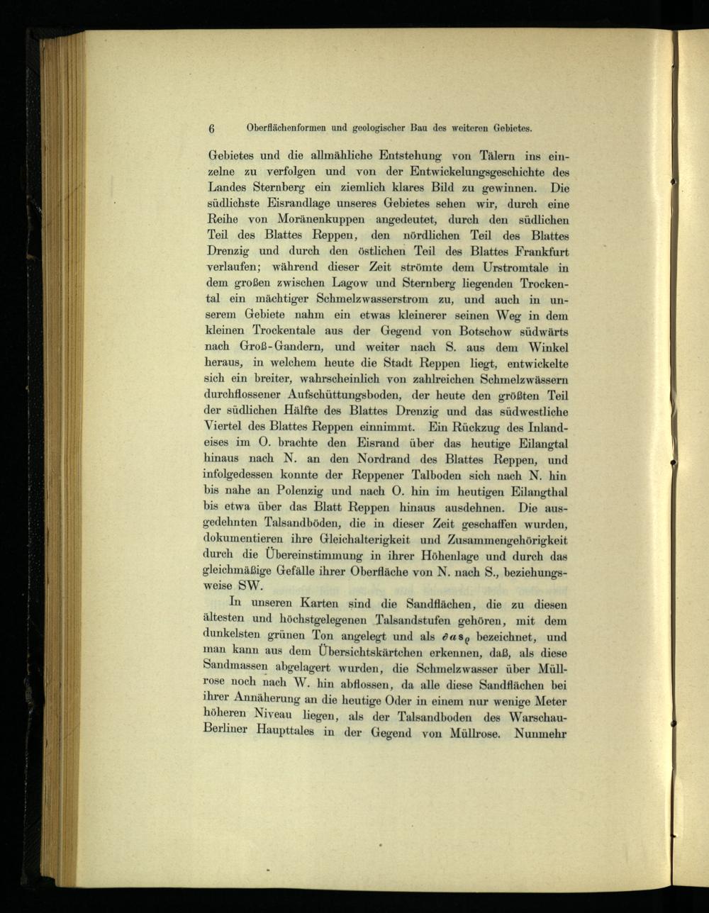 Gebietes und die allmähliche Entstehung von Tälern ins einzelne zu verfolgen und von der Eintwickelungsgeschichte des Landes Sternberg ein ziemlich klares Bild zu gewinnen. Die südlichste Eisrandlage unseres Gebietes sehen wir, durch eine Reihe von Moränenkuppen angedeutet, durch den südlichen Teil des Blattes Reppen , den nördlichen Teil des Blattes Drenzig und durch den östlichen Teil des Blattes Frankfurt verlaufen; während dieser Zeit strömte dem Urstromtale in dem großen zwischen Lagow und Sternberg liegenden Trockental ein mächtiger Schmelzwasserstrom zu, und auch in unserem Gebiete nahm ein etwas kleinerer seinen Weg in dem kleinen Trockentale aus der Gegend von Botschow südwärts nach Groß-Gandern, und weiter nach S. aus dem Winkel heraus, in welchem heute die Stadt Reppen liegt, entwickelte sich ein breiter, wahrscheinlich von zahlreichen Schmelzwässern durchflossener Aufschüttungsboden, der heute den größten Teil der südlichen Hälfte des Blattes Drenzig und das südwestliche Viertel des Blattes Reppen einnimmt. Ein Rückzug des Inlandeises im O. brachte den KEisrand über das heutige Eilangtal hinaus nach N. an den Nordrand des Blattes Reppen , und infolgedessen konnte der Reppener Talboden sich nach N. hin bis nahe an Polenzig und nach O. hin im heutigen Eilangthal bis etwa über das Blatt Reppen hinaus ausdehnen. Die ausgedehnten Talsandböden, die in dieser Zeit geschaffen wurden, dokumentieren. ihre GHeichalterigkeit und Zusammengehörigkeit durch die Übereinstimmung in ihrer Höhenlage und durch das gleichmäßige Gefälle ihrer Oberfläche von N. nach S., beziehungsweise SW.
