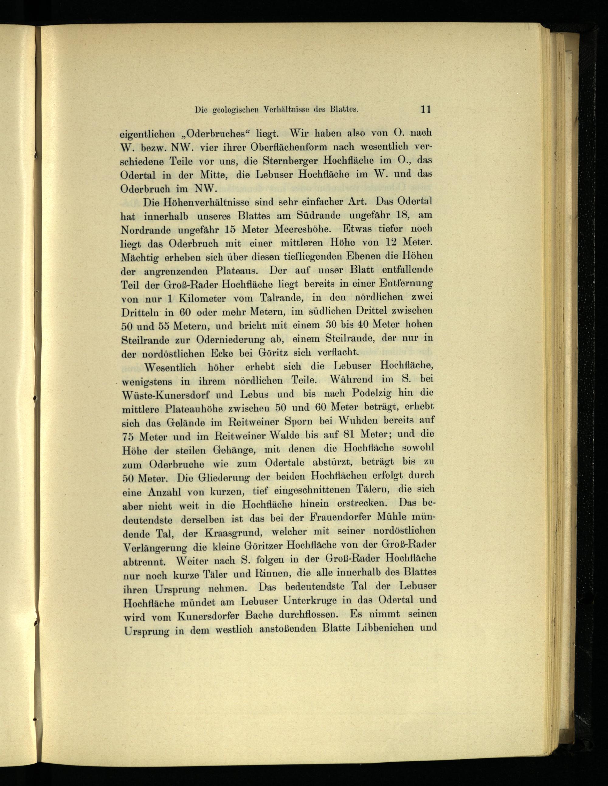 eigentlichen„Oderbruches“ liegt. Wir haben also von O. nach W. bezw. NW. vier ihrer Oberflächenform nach wesentlich verschiedene Teile vor uns, die Sternberger Hochfläche im O., das Odertal in der Mitte, die Lebuser Hochfläche im W. und das Oderbruch im NW .