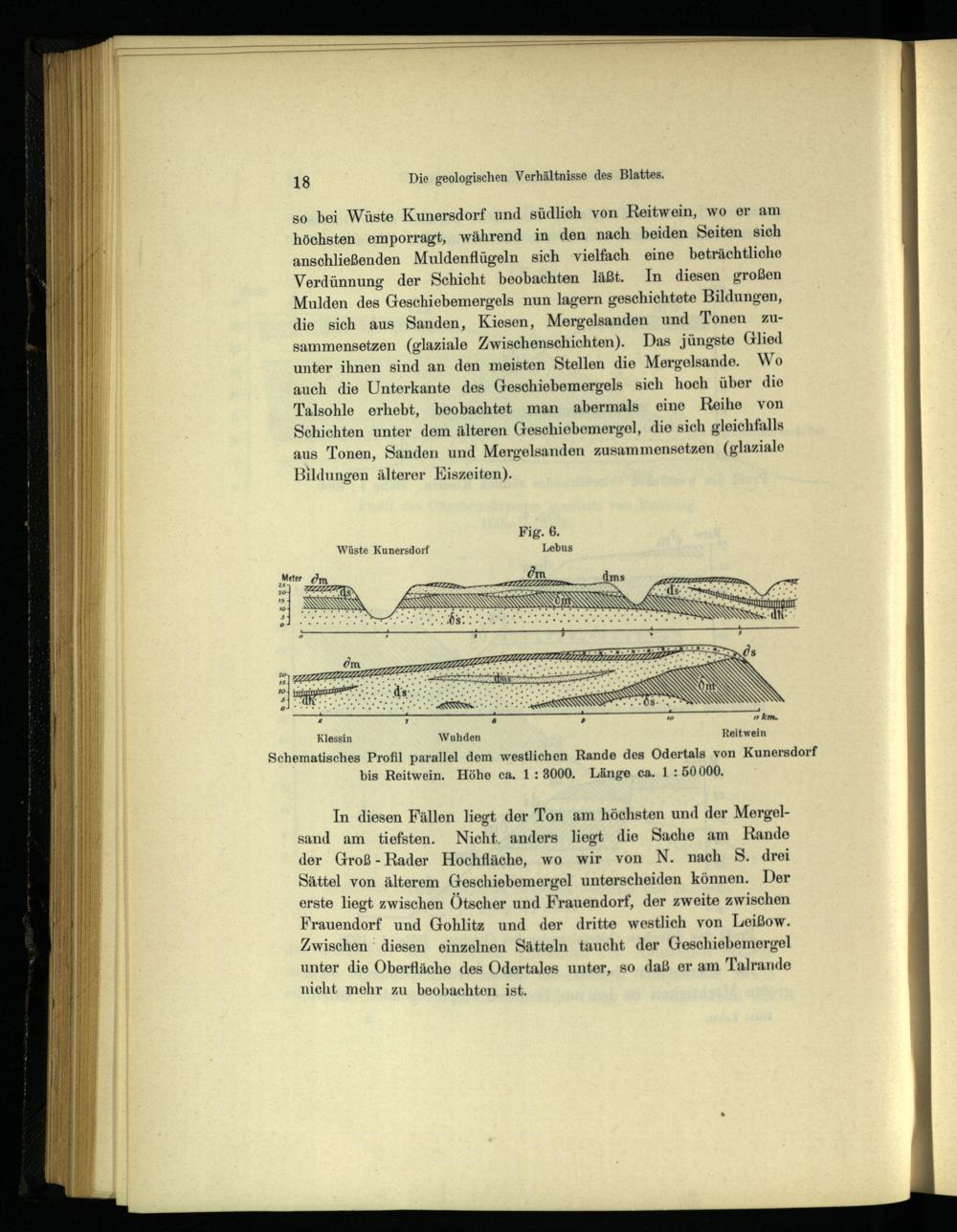so bei Wüste Kunersdorf und südlich von Reitwein , wo er am höchsten emporragt, während in den nach beiden Seiten sich anschließenden Muldenflügeln sich vielfach eine beträchtliche Verdünnung der Schicht beobachten läßt. In diesen großen Mulden des Geschiebemergels nun lagern geschichtete Bildungen, die sich aus Sanden , Kiesen, Mergelsanden und Tonen zusammensetzen(glaziale Zwischenschichten). Das jüngste Glied unter ihnen sind an den meisten Stellen die Mergelsande. Wo auch die Unterkante des Greschiebemergels sich hoch über die Talsohle erhebt, beobachtet man abermals eine Reihe von Schichten unter dem älteren Geschiebemergel, die sich gleichfalls aus Tonen, Sanden und Mergelsanden zusammensetzen(glaziale