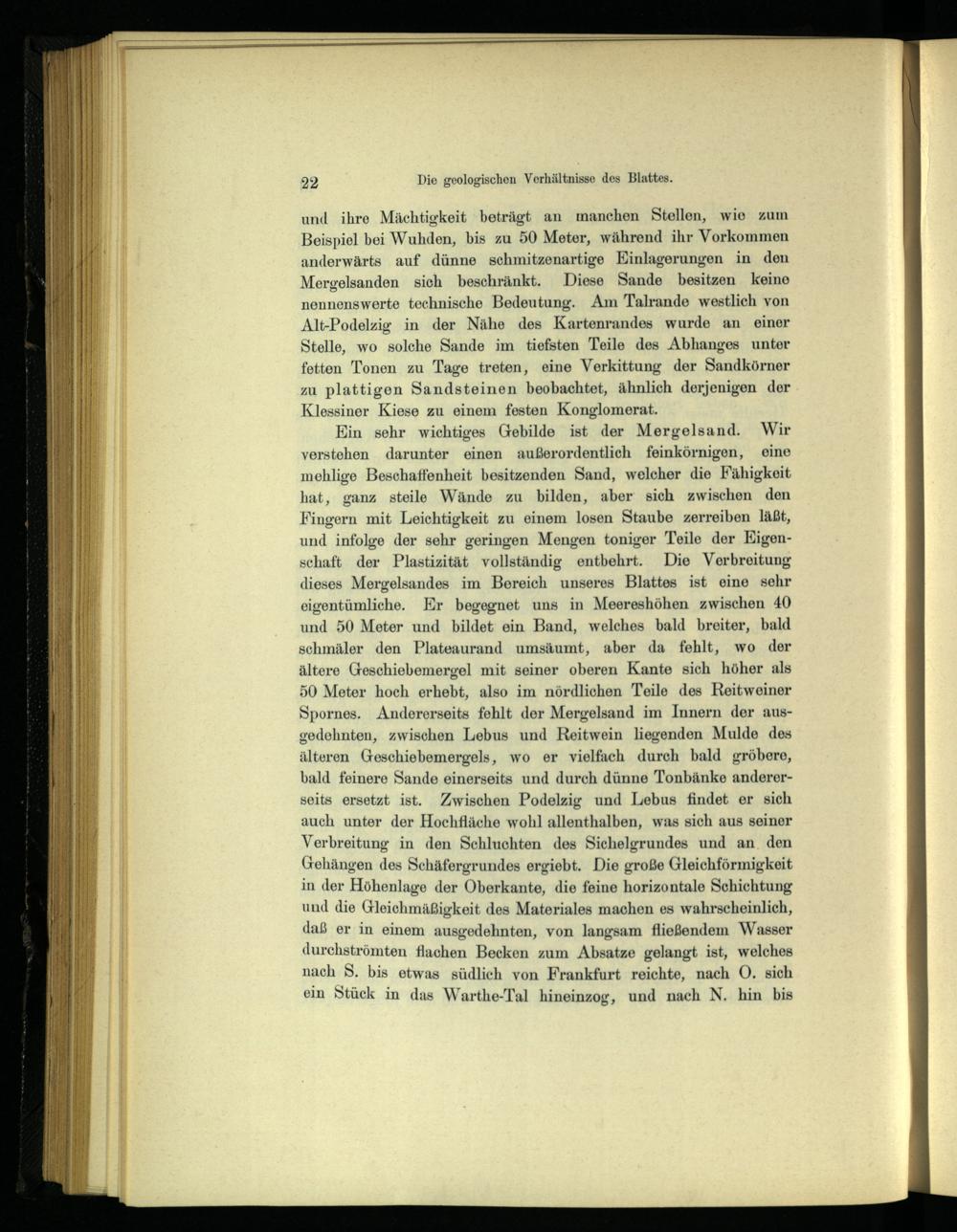und ihre Mächtigkeit beträgt an manchen Stellen, wie zum Beispiel bei Wuhden, bis zu 50 Meter, während ihr Vorkommen anderwärts auf dünne schmitzenartige Einlagerungen in den Mergelsanden sich beschränkt. Diese Sande besitzen keine nennenswerte technische Bedeutung. Am Talrande westlich von Alt-Podelzig in der Nähe des Kartenrandes wurde an einer Stelle, wo solche Sande im tiefsten Teile des Abhanges unter fetten Tonen zu Tage treten, eine Verkittung der Sandkörner zu plattigen Sandsteinen beobachtet, ähnlich derjenigen der Klessiner Kiese zu einem festen Konglomerat.