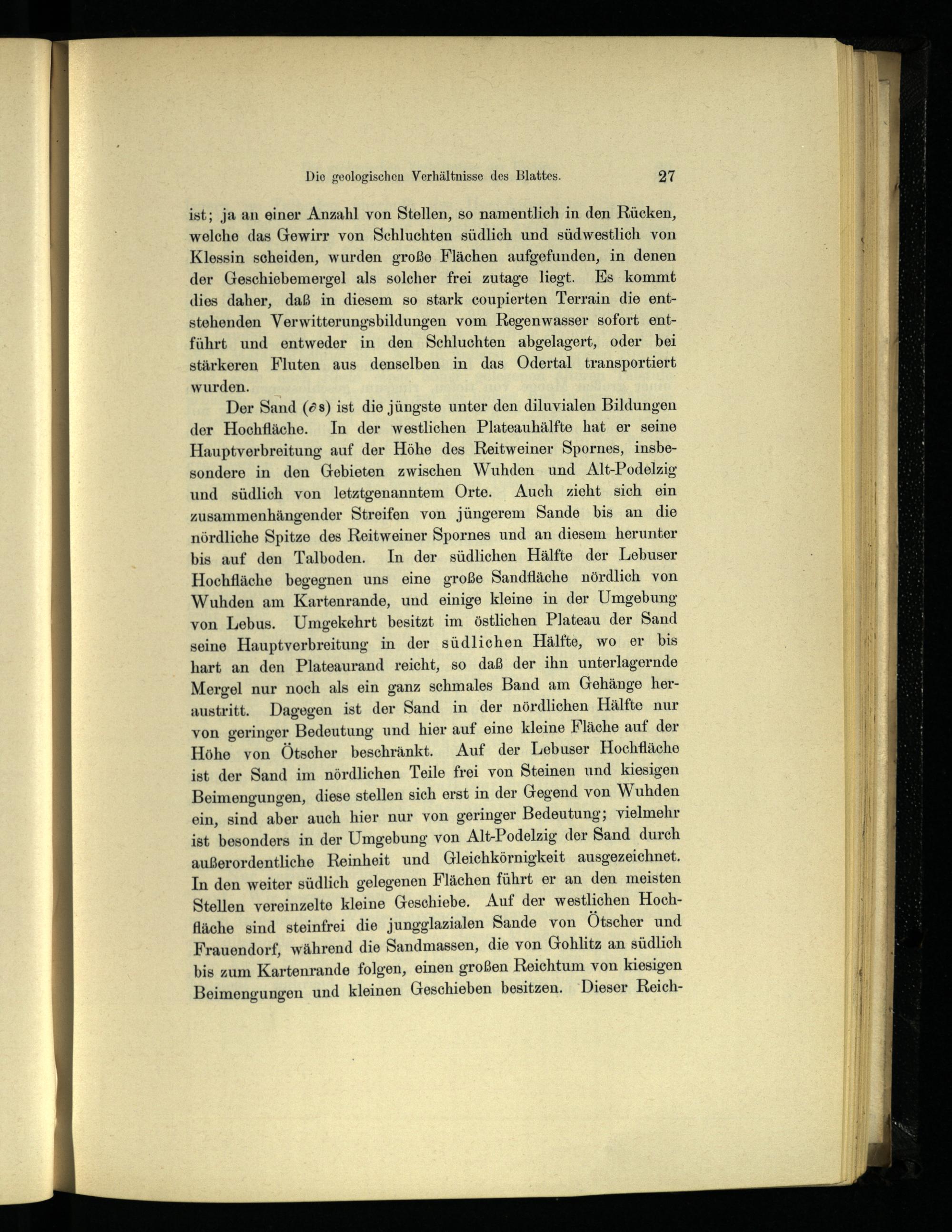 Der Sand(6ös) ist die jüngste unter den diluvialen Bildungen der Hochfläche. In der westlichen Plateauhälfte hat er seine Hauptverbreitung auf der Höhe des Reitweiner Spornes, insbesondere in den Gebieten zwischen Wuhden und Alt-Podelzig und südlich von letztgenanntem Orte. Auch zieht sich ein zusammenhängender Streifen von jüngerem Sande bis an die nördliche Spitze des Reitweiner Spornes und an diesem herunter bis auf den Talboden. In der südlichen Hälfte der Lebuser Hochfläche begegnen uns eine große Sandfläche nördlich von Wuhden am Kartenrande, und einige kleine in der Umgebung von Lebus . Umgekehrt besitzt im östlichen Plateau der Sand seine Hauptverbreitung in der südlichen Hälfte, wo er bis hart an den Plateaurand reicht, so daß der ihn unterlagernde Mergel nur noch als ein ganz schmales Band am Gehänge heraustritt. Dagegen ist der Sand in der nördlichen Hälfte nur von geringer Bedeutung und hier auf eine kleine Fläche auf der Höhe von Ötscher beschränkt. Auf der Lebuser Hochfläche ist der Sand im nördlichen Teile frei von Steinen und kiesigen Beimengungen, diese stellen sich erst in der Gegend von Wuhden ein, sind aber auch hier nur von geringer Bedeutung; vielmehr ist besonders in der Umgebung von Alt-Podelzig der Sand durch außerordentliche Reinheit und Gleichkörnigkeit ausgezeichnet. In den weiter südlich gelegenen Flächen führt er an den meisten Stellen vereinzelte kleine Geschiebe. Auf der westlichen Hochfläche sind steinfrei die jungglazialen Sande von Ötscher und Frauendorf, während die Sandmassen, die von Gohlitz an südlich bis zum Kartenrande folgen, einen großen Reichtum von kiesigen Beimengungen und kleinen Geschieben besitzen. Dieser Reich