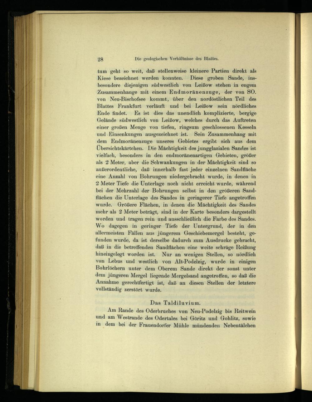 tum geht so weit, daß stellenweise kleinere Partien direkt als Kiese bezeichnet werden konnten. Diese groben Sande, insbesondere diejenigen südwestlich von Leißow stehen in engem Zusammenhange mit einem Endmoränenzuge, der von SO. von Neu-Bischofsee kommt, über den nordöstlichen Teil des Blattes Frankfurt verläuft und bei Leißow sein nördliches Ende findet. Es ist dies das unendlich komplizierte, bergige Gelände südwestlich von Leißow, welches durch das Auftreten einer großen Menge von tiefen, ringsum geschlossenen Kesseln und.Einsenkungen ausgezeichnet ist. Sein Zusammenhang mit dem Endmoränenzuge unseres Gebietes ergibt sich aus dem Übersichtskärtchen. Die Mächtigkeit des jungglazialen Sandes ist vielfach, besonders in den endmoränenartigen Gebieten, größer als 2 Meter, aber die Schwankungen in der Mächtigkeit sind so außerordentliche, daß innerhalb fast jeder einzelnen Sandfläche eine Anzahl von Bohrungen niedergebracht wurde, in denen in 2 Meter Tiefe die Unterlage noch nicht erreicht wurde, während bei der Mehrzahl der Bohrungen selbst in den größeren Sandflächen die Unterlage des Sandes in geringerer Tiefe angetroffen wurde. Größere Flächen, in denen die Mächtigkeit des Sandes mehr als 2 Meter beträgt, sind in der Karte besonders dargestellt worden und tragen rein und ausschließlich die Farbe des Sandes. Wo dagegen in geringer Tiefe der Untergrund, der in den allermeisten Fällen aus jüngerem Geschiebemergel besteht, gefunden wurde, da ist derselbe dadurch zum Ausdrucke gebracht, daß in die betreffenden Sandflächen eine weite schräge Reißung hineingelegt worden ist. Nur an wenigen Stellen, so nördlich von Lebus und westlich von Alt-Podelzig, wurde in einigen Bohrlöchern unter dem Oberem Sande direkt der sonst unter dem jüngeren Mergel liegende Mergelsand angetroffen, so daß die Annahme gerechtfertigt ist, daß an diesen Stellen der letztere vollständig zerstört wurde.