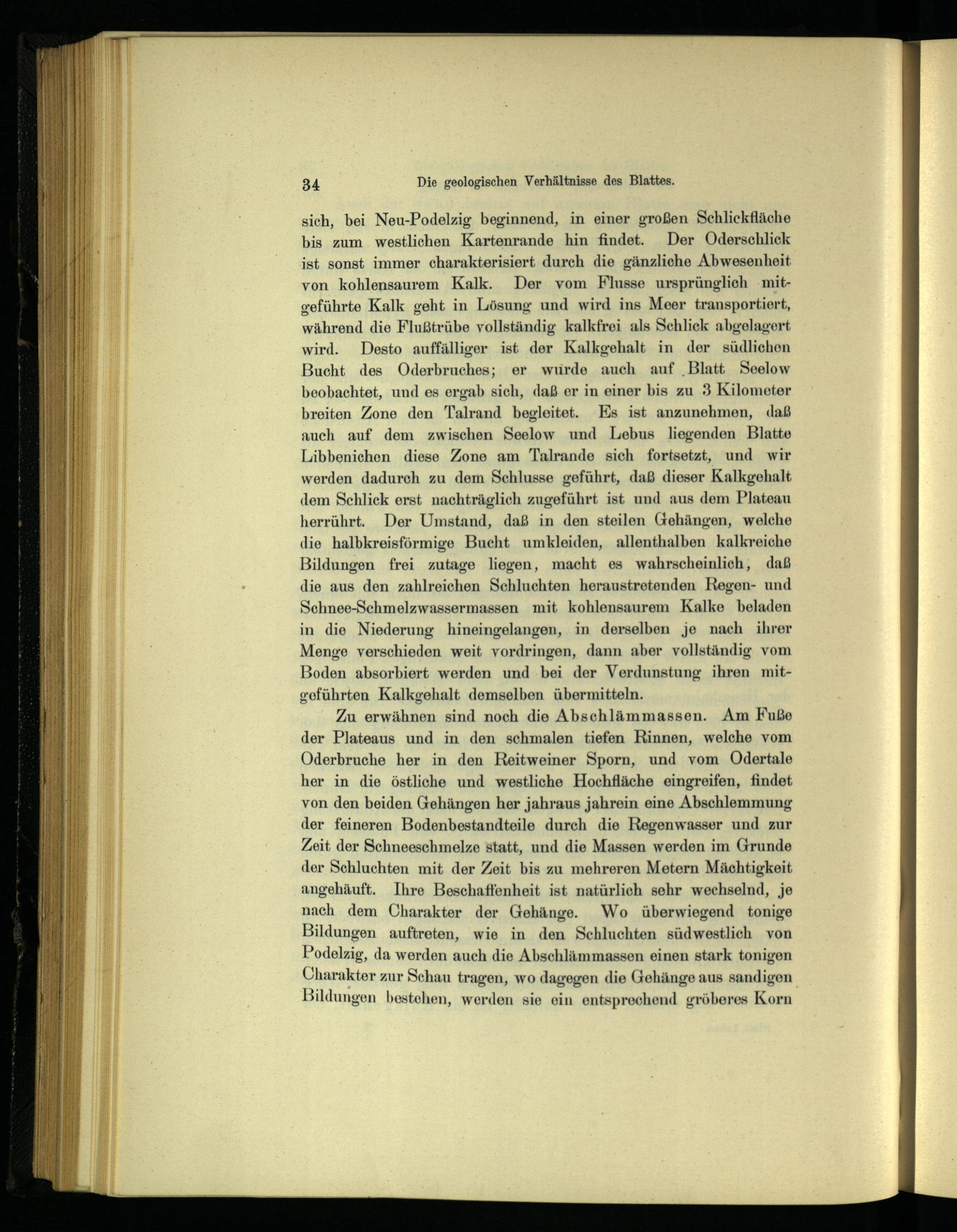 sich, bei Neu-Podelzig beginnend, in einer großen Schlickfläche bis zum westlichen Kartenrande hin findet. Der Oderschlick ist sonst immer charakterisiert durch die gänzliche Abwesenheit von kohlensaurem Kalk. Der vom Flusse ursprünglich ‚mitgeführte Kalk geht in Lösung und wird ins Meer transportiert, während die Flußtrübe vollständig kalkfrei als Schlick abgelagert wird. Desto auffälliger ist der Kalkgehalt in der südlichen Bucht des Oderbruches; er wurde auch auf Blatt Seelow beobachtet, und es ergab sich, daß er in einer bis zu 3 Kilometer breiten Zone den"Talrand begleitet. Es ist anzunehmen, daß auch auf dem zwischen Seelow und Lebus liegenden Blatte Libbenichen diese Zone am Talrande sich fortsetzt, und wir werden dadurch zu dem Schlusse geführt, daß dieser Kalkgehalt dem Schlick erst nachträglich zugeführt ist und aus dem Plateau herrührt. Der Umstand, daß in den steilen Gehängen, welche die halbkreisförmige Bucht umkleiden, allenthalben kalkreiche Bildungen frei zutage liegen, macht es wahrscheinlich, daß die aus den zahlreichen Schluchten heraustretenden Regen- und Schnee-Schmelzwassermassen mit kohlensaurem Kalke beladen in die Niederung hineingelangen, in derselben je nach ihrer Menge verschieden weit vordringen, dann aber vollständig vom Boden absorbiert werden und ‚bei der Verdunstung ihren mitgeführten Kalkgehalt demselben übermitteln.