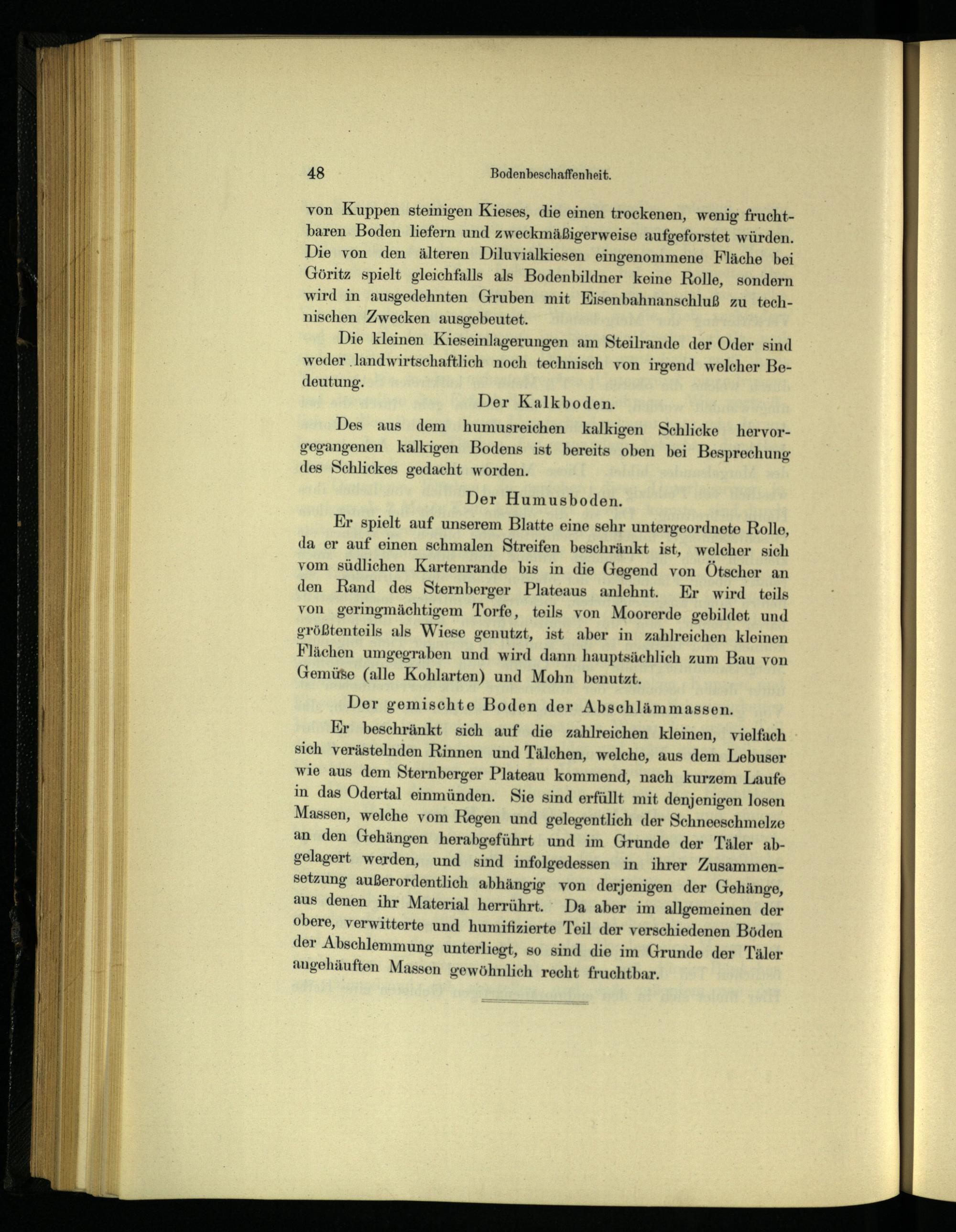 Er beschränkt sich auf die zahlreichen kleinen, vielfach sich verästelnden Rinnen und Tälchen, welche, aus dem Lebuser wie aus dem Sternberger Plateau kommend, nach kurzem Laufe in das Odertal einmünden. Sie sind erfüllt mit denjenigen losen Massen, welche vom Regen und gelegentlich der Schneeschmelze an. den Gehängen herabgeführt und im Grunde der Täler abgelagert werden, und sind infolgedessen in ihrer Zusammensetzung außerordentlich abhängig von derjenigen der Gehänge, aus denen ihr Material herrührt.‘Da aber im allgemeinen der obere, verwitterte und humifizierte Teil der verschiedenen Böden der Abschlemmung unterliegt, so sind die im Grunde der Täler angehäuften Massen gewöhnlich recht fruchtbar.
