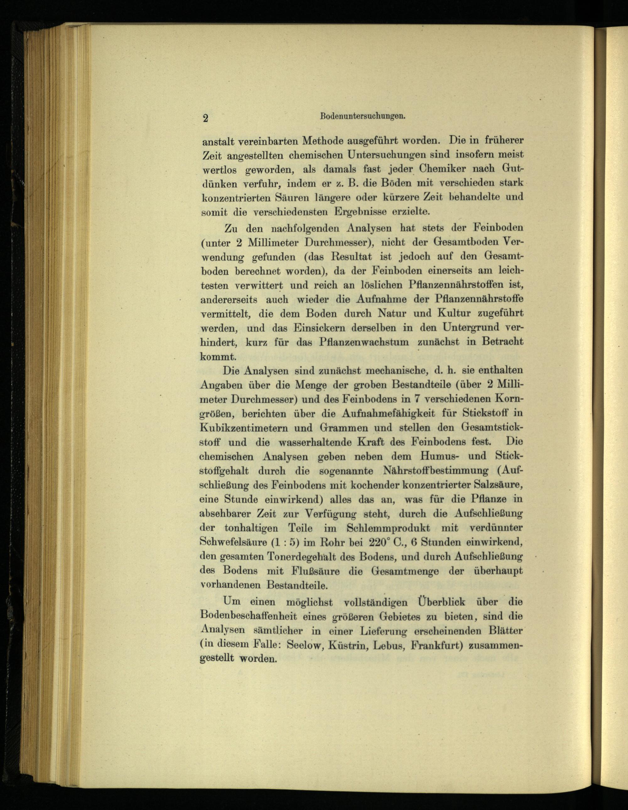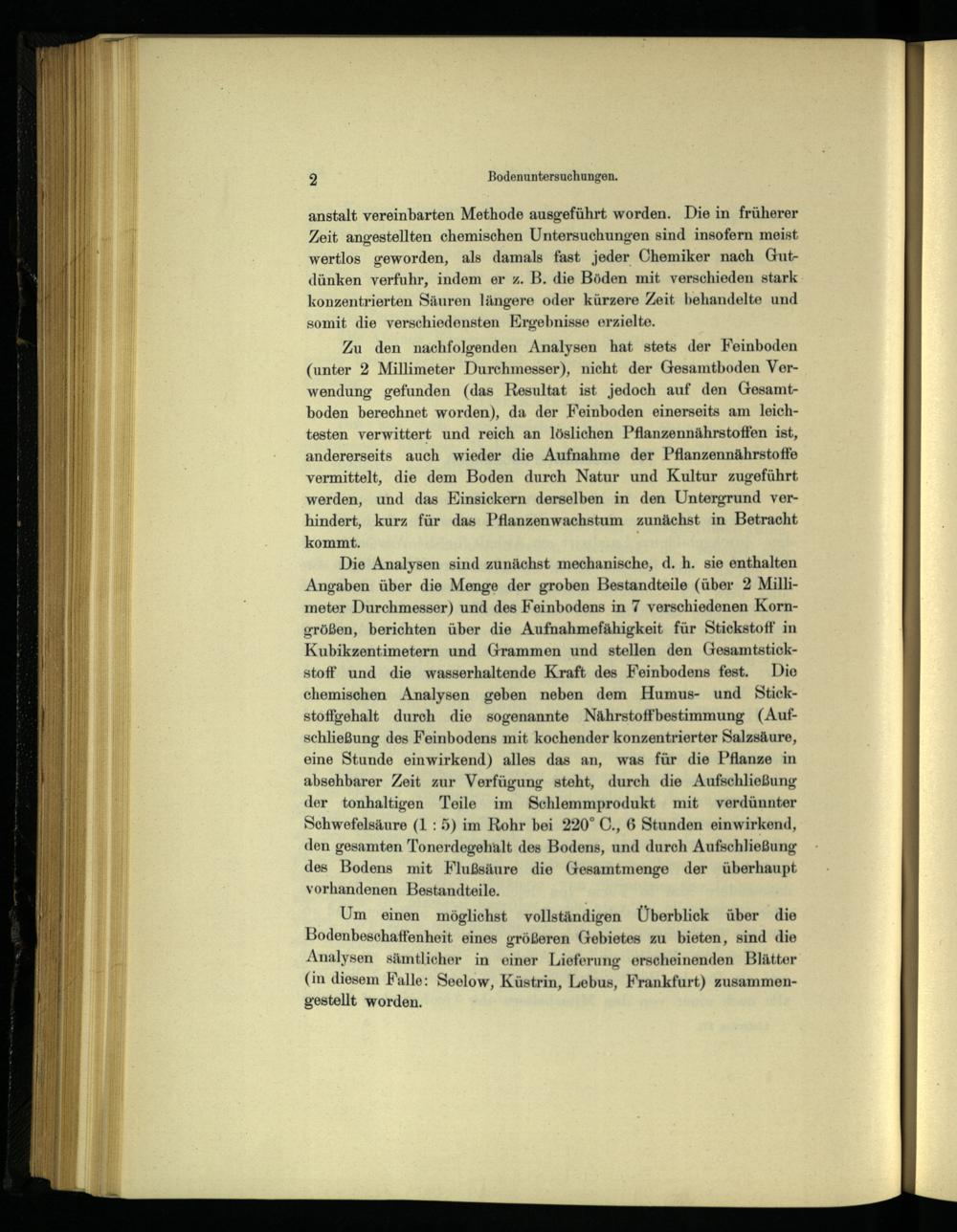 Zu den nachfolgenden Analysen hat stets der Feinboden (unter 2 Millimeter Durchmesser), nicht der Gesamtboden Ver­wendung gefunden(das Resultat ist jedoch auf den Gesamt­boden berechnet worden), da der Feinboden einerseits am leich­testen verwittert und reich an löslichen Pflanzennährstoffen ist, andererseits auch wieder die Aufnahme der Pflanzennährstoffe vermittelt, die dem Boden durch Natur und Kultur zugeführt werden, und das Einsickern derselben in den Untergrund ver­hindert, kurz für das Pflanzenwachstum zunächst in Betracht kommt.